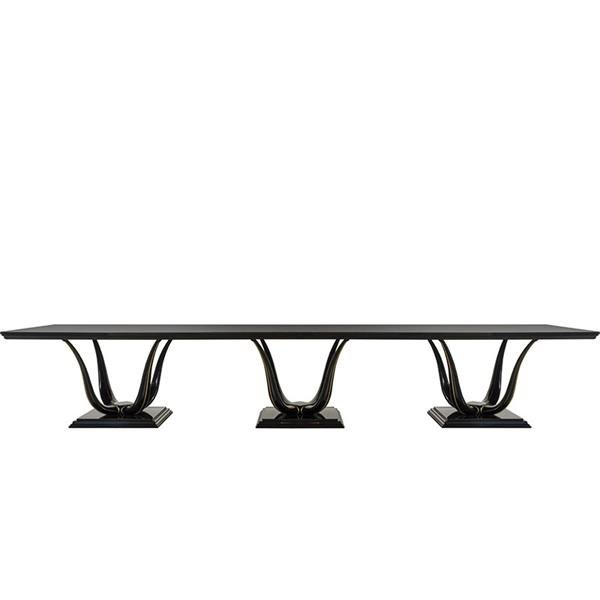 Stół Corallo firmy Galimberti Nino został wykonany z lakierowanym blatem i obramowaniem z litego drewna profilowanego. Kolumny z litego drewna z wstawkami z satynowego mosiądzu lub brązu. Wymiary: 400 x 120 x 76 cm. Podana cena jest poglądową, uzależnioną od dobranych materiałów.