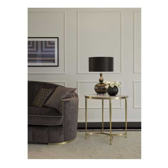 - Stolik Ferrando firmy Galimberti Nino został wykonany blatem z marmuru malowanego poliestrem. Struktura z satynowego mosiądzu.