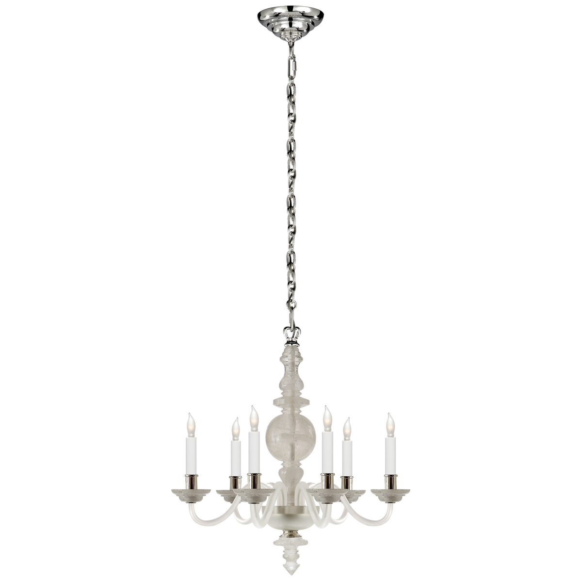 - Żyrandol George II Small firmy E.F.Chapman został wykonany z kwarcu oraz wykończony polerowanym srebrem. Lampa posiada gniazdo na żarówkę E 14.