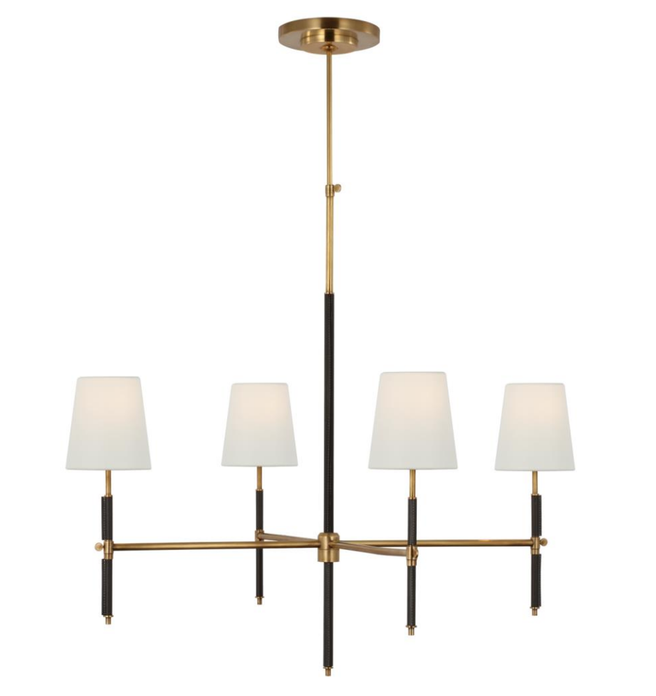 - Żyrandol Bryant Large Wrapped projektu Thomas O'Brien marki Visual Comfort z ręcznie polerowanego mosiądzu antycznego i ciemnej czekoladowej skóry z lnianymi kloszami.