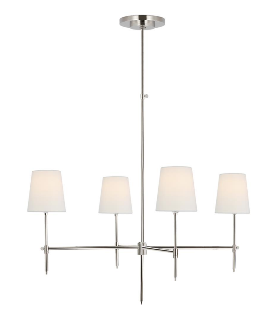 Żyrandol Bryant Large projektu Thomas O'Brien marki Visual Comfort z polerowanego niklu z lnianymi abażurami. Lampa posiada gniazdo na żarówkę E 27. Wymiary: wys. 119.4 x szer. 91.4 cm.