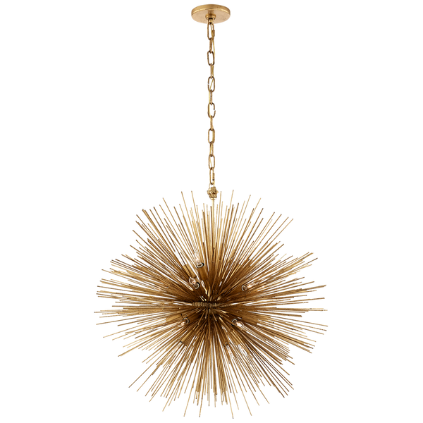 Żyrandol Strada Medium Round projektu Kelly Wearstler w kolorze postarzanego złota, rzucają prążkowaną poświatę na sufit. Lampa posiada gniazdo na żarówkę E 14. Wymiary: wys. 71,8 x szer. 71,1 cm