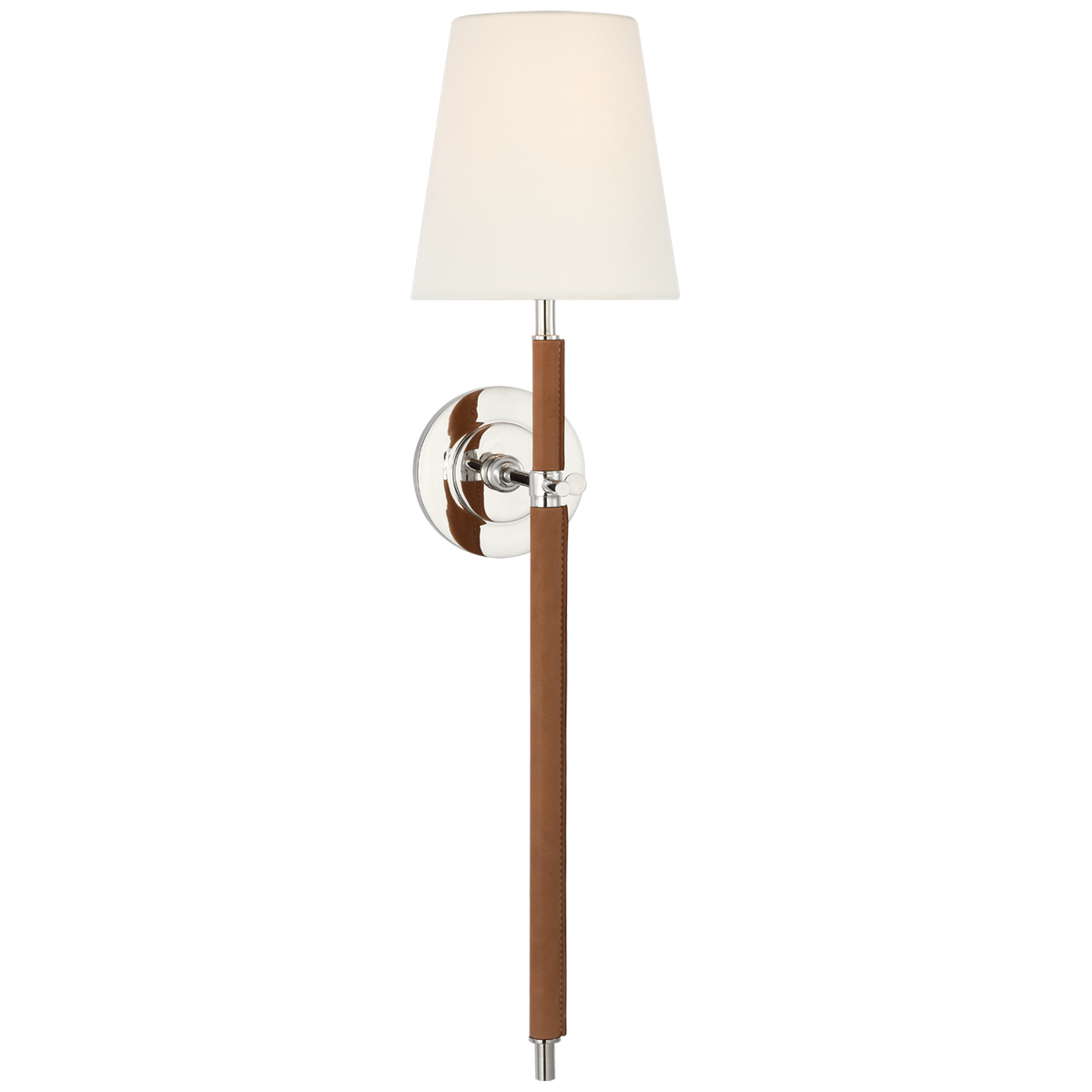 Kinkiet Bryant Large Wrapped projektu Thomas O'Brien został wykonany z polerowanego niklu pokrytego naturalną skórą, wykończony lnianym abażurem. Lampa posiada gniazdo na żarówkę E 27. Wymiary: wys. 66 x szer. 16,5 cm.