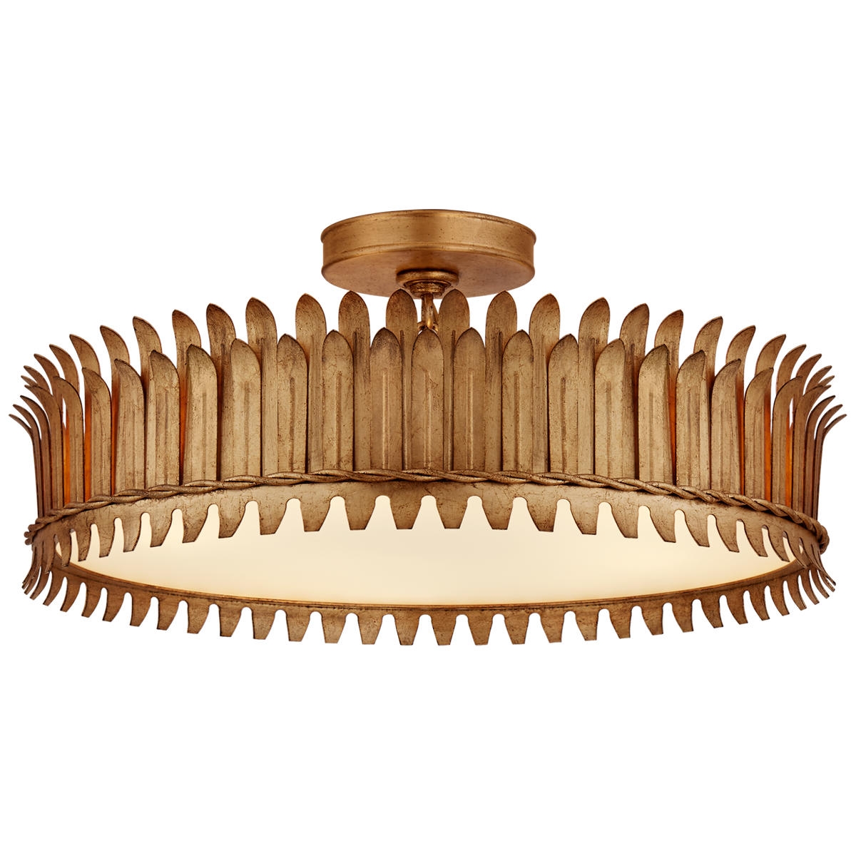 Plafon Leslie 20" projektu Suzanne Kasler został wykonany ze złoconego żelaza oraz wykończony matowym szkłem.