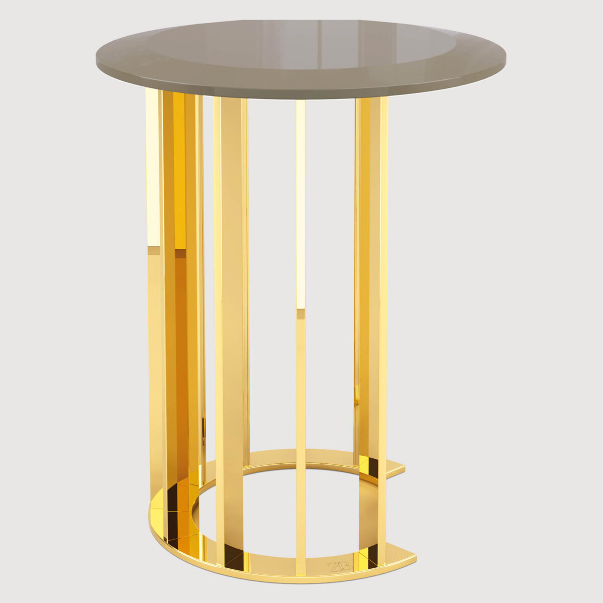 - Stolik boczny Triton firmy Bruno Zampa w podstawowej wersji wykończony złotą metalową ramą i drewnianym blatem. Marmurowe wykończenie za dopłatą. Produkt dostępny w różnych wykończeniach.