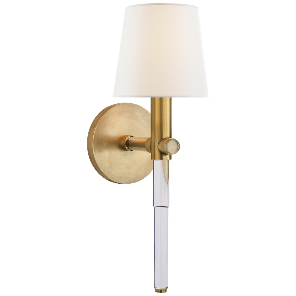 Kinkiet Sable Tail projektu Ralph Lauren Home został wykonany z kryształu, naturalnego mosiądzu oraz wykończony lnianym abażurem.