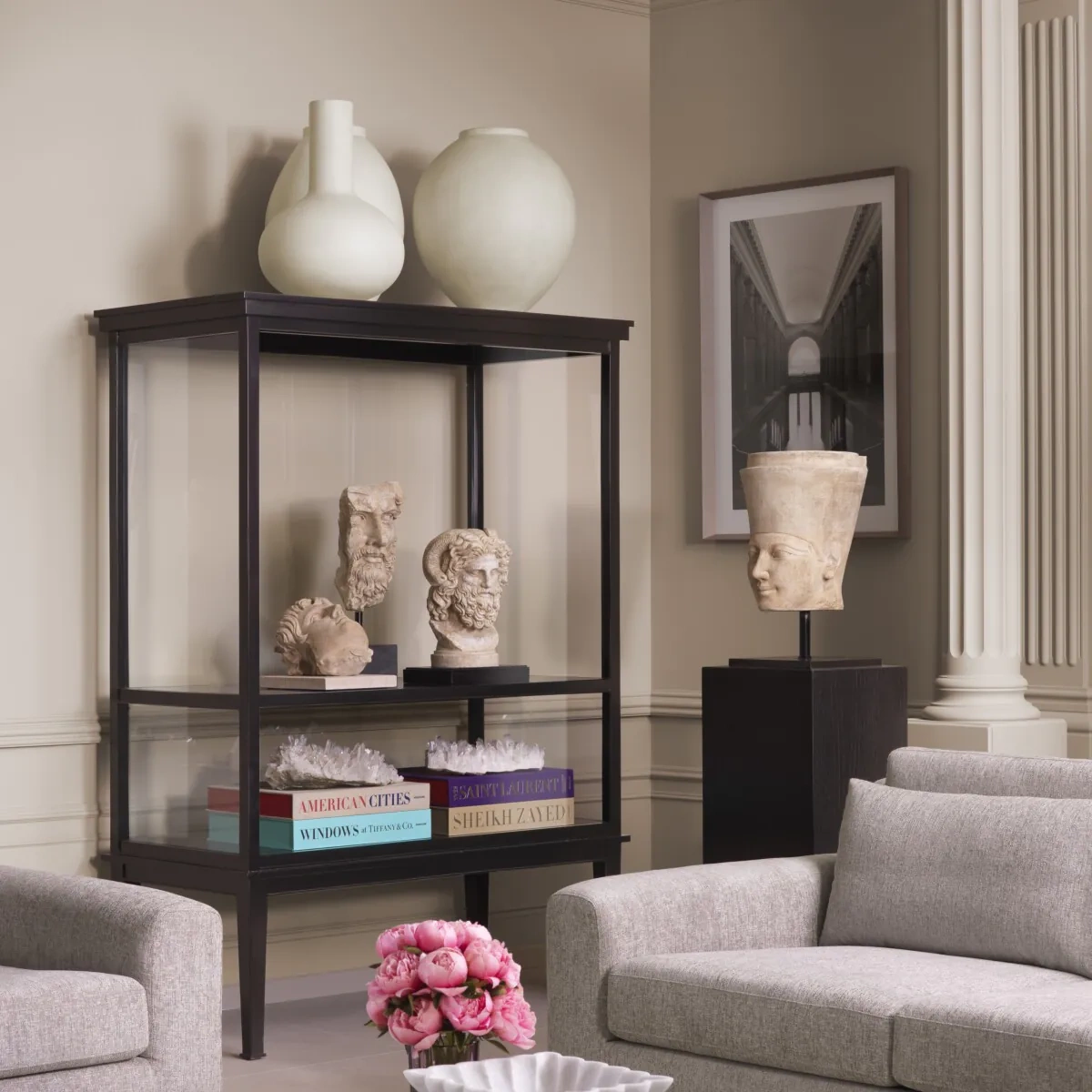 - Witryna Gallery marki Eichholtz wykonana z czarnego forniru i przezroczystego szkła, stanowi elegancką oprawę dla wyjątkowych przedmiotów i dzieł sztuki, podkreślając ich charakter i historię.
