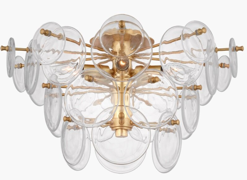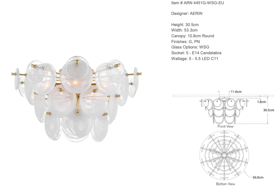 - Plafon Loire projektu Aerin został pokryty złotem oraz wykończony szkłem w białym kolorze. Lampa posiada gniazdo na żarówkę E 14.