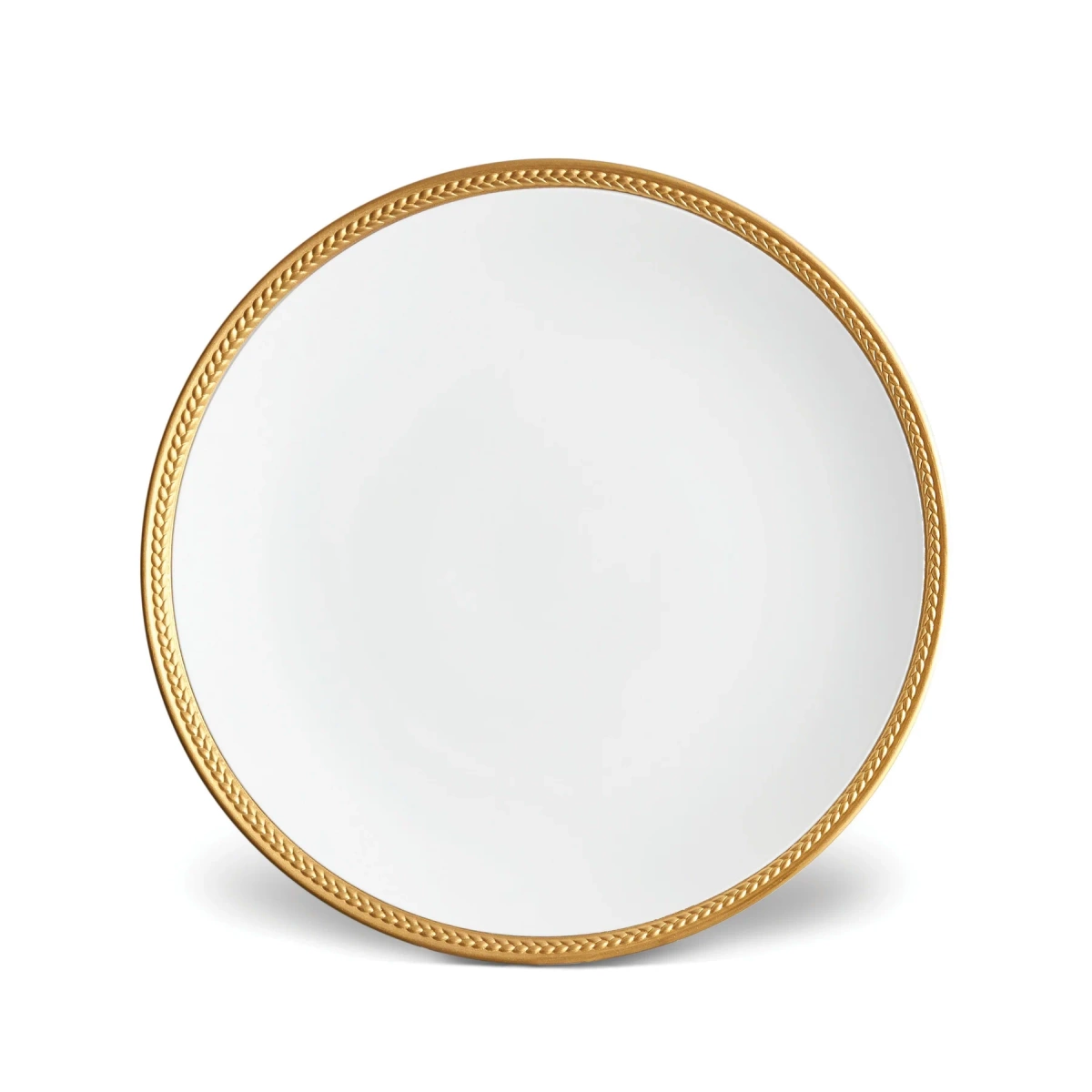 Talerz obiadowy firmy L'Objet, z kolekcji Soie Tressée został wykonany z porcelany Limoges, pokryty 24 karatowym złotem oraz wykończony w białym kolorze.