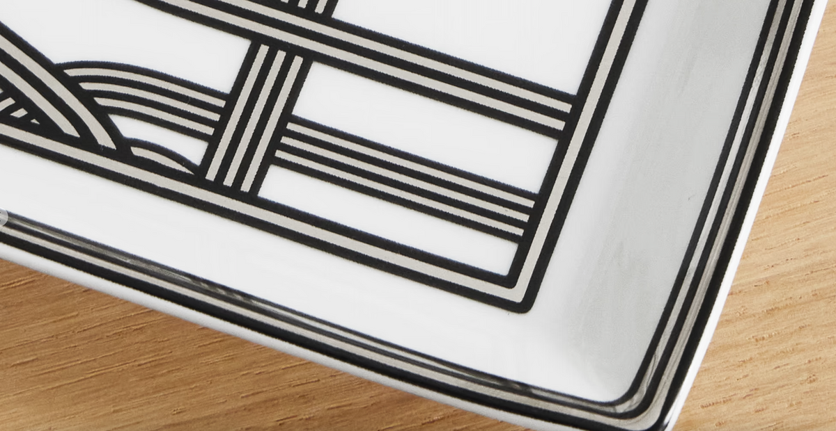 - Taca Berken marki Ralph Lauren Home, na przedmioty codziennego użytku i biżuterię, wykonana z porcelany ozdobiona platynowym graficznym motywem marki na środku.