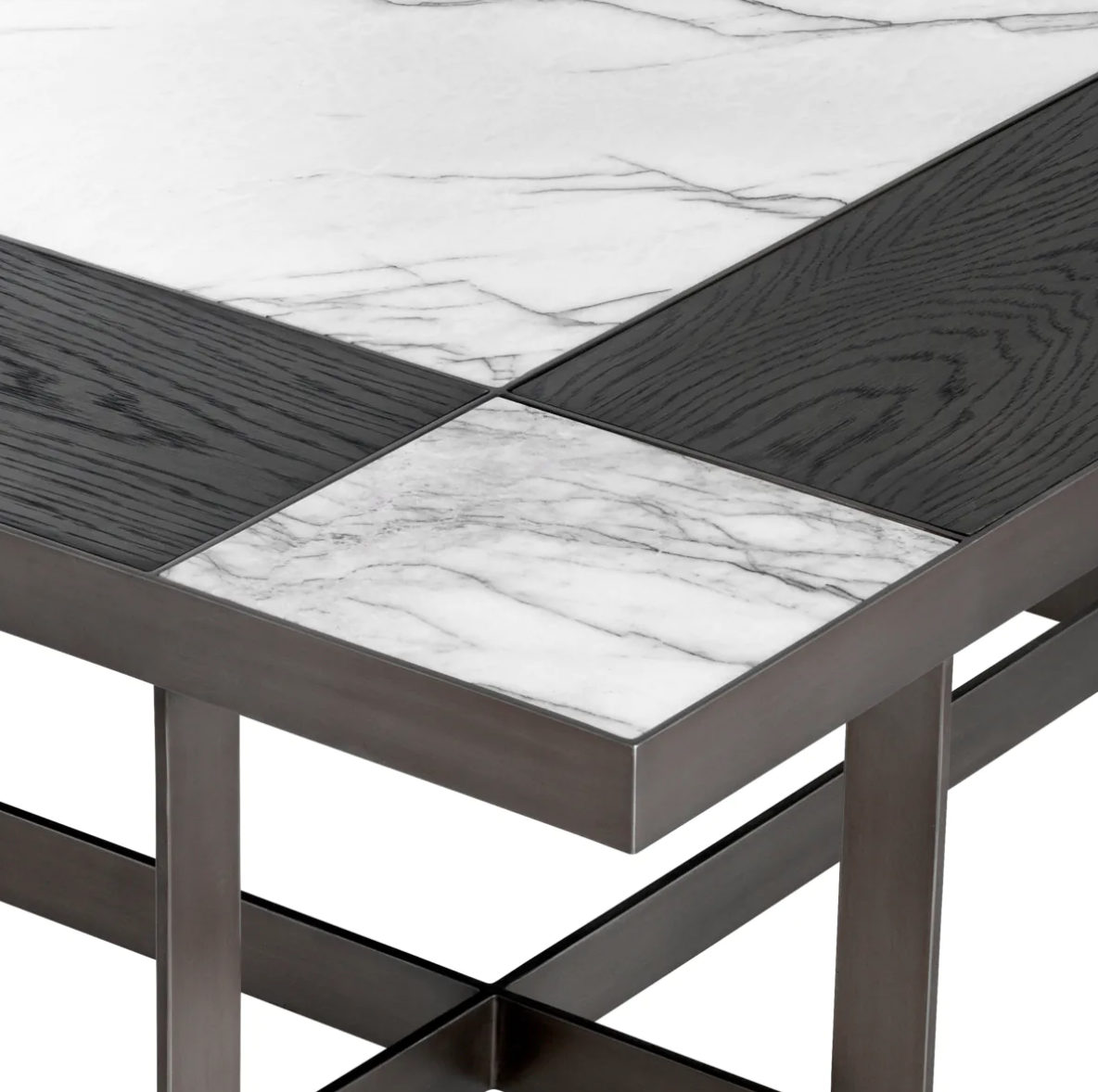 - Stolik kawowy Hermoza marki Eichholtz łączy w sobie bogactwo włoskiego marmuru bianco lilac i retro wygląd forniru dębowego mokka, posiada metalową ramę z cynowym wykończeniem.
