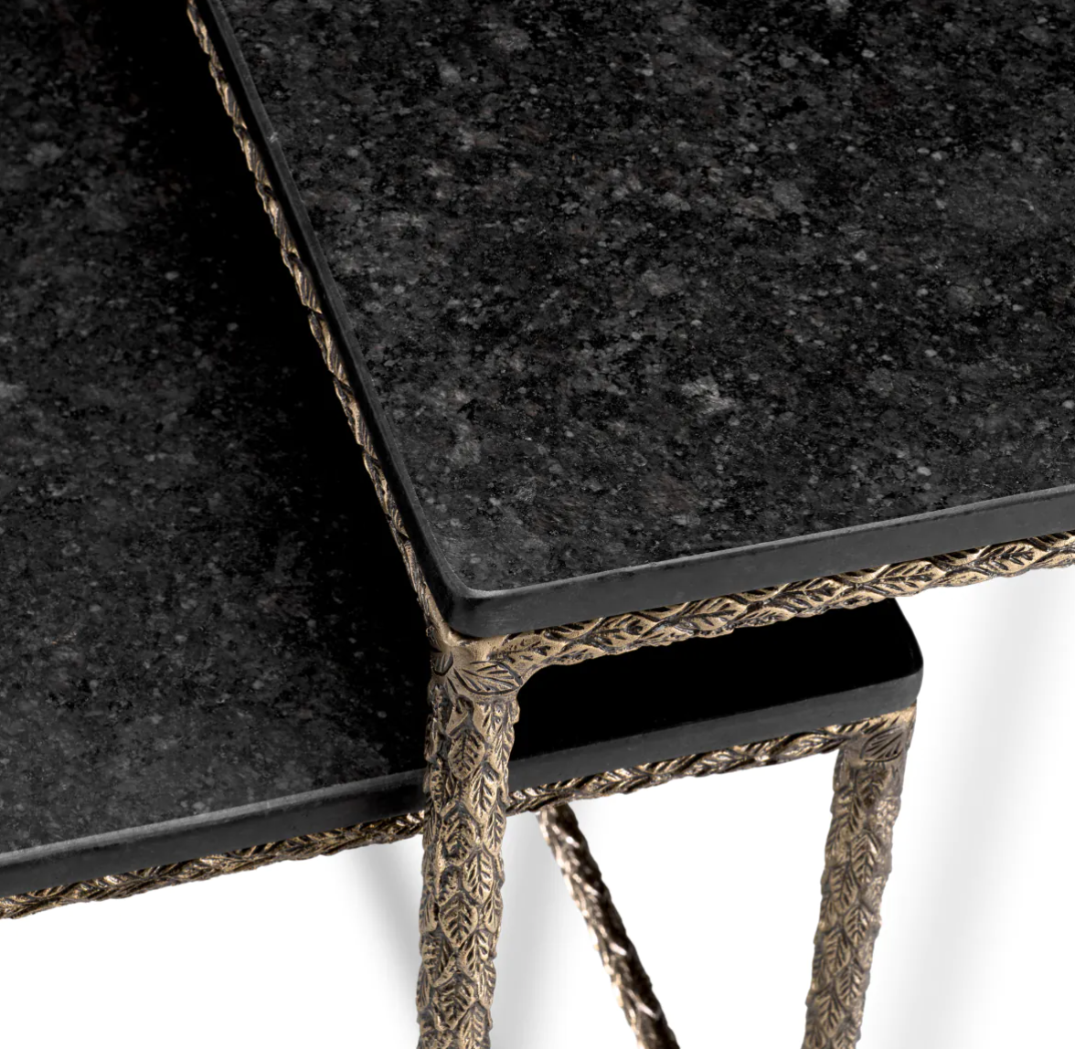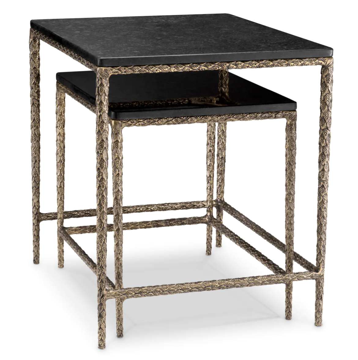 Stolik boczny Ferndale marki Eichholtz, zestaw dwóch sztuk, posiada kwadratowe blaty z luksusowego czarnego granitu, każdy osadzony na zabytkowej mosiężnej podstawie.