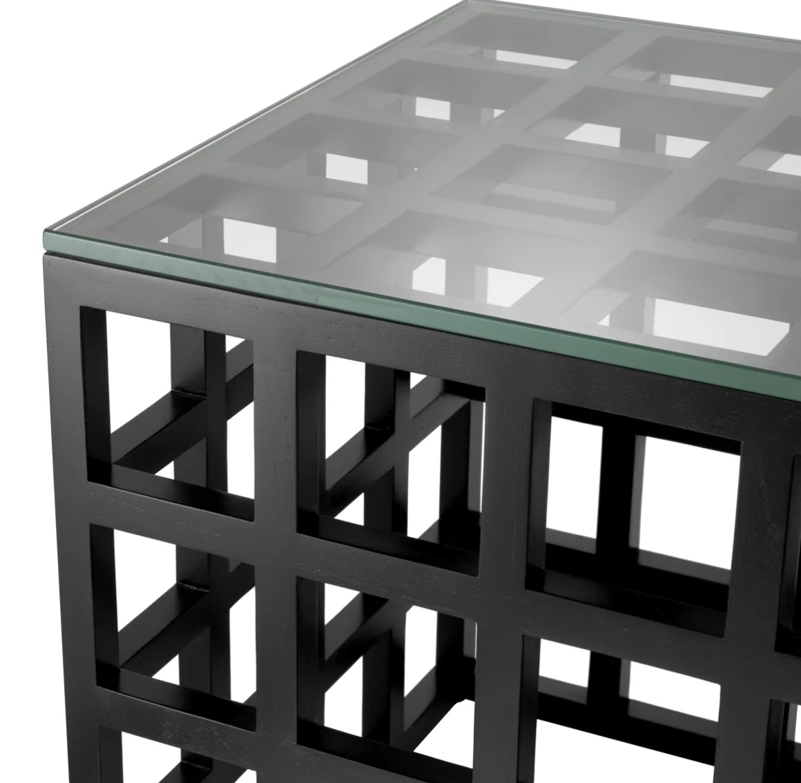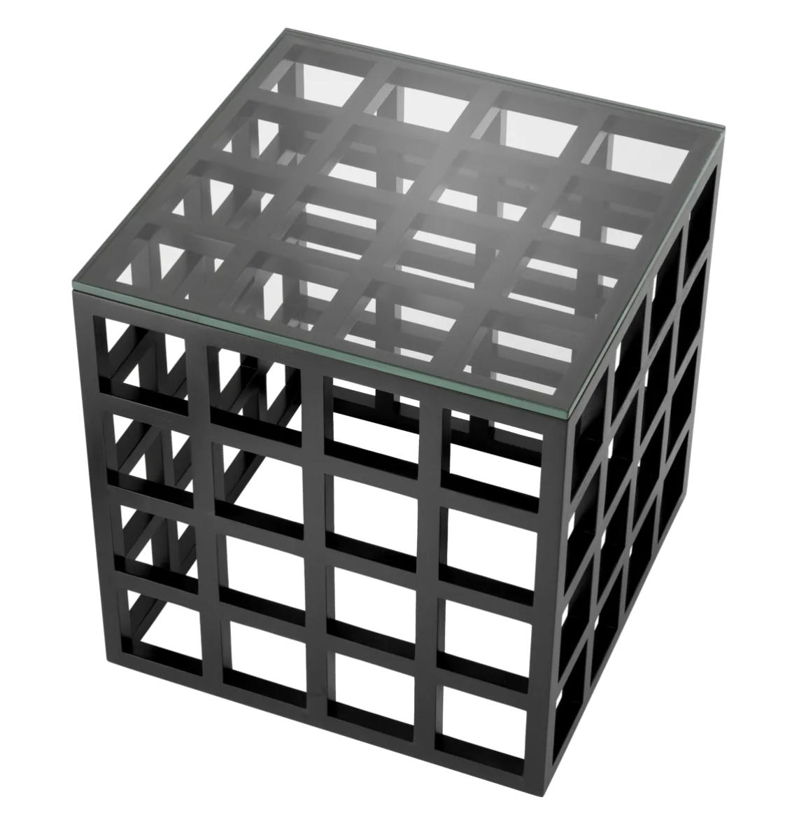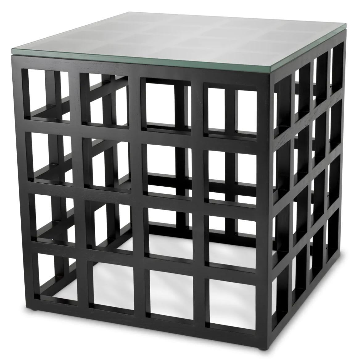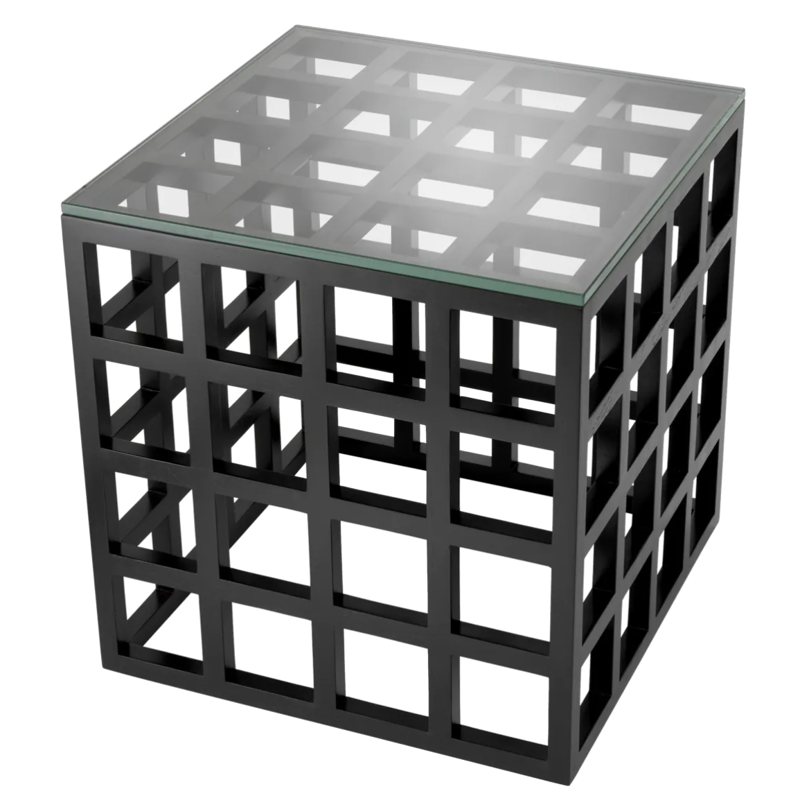 Stolik boczny Cubico marki Eichholtz posiada klasyczne czarne wykończenie i unikalną geometryczną podstawę wykonaną z eleganckiego czarnego szkła.