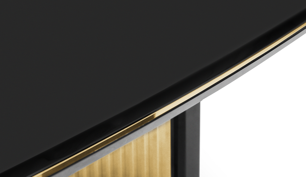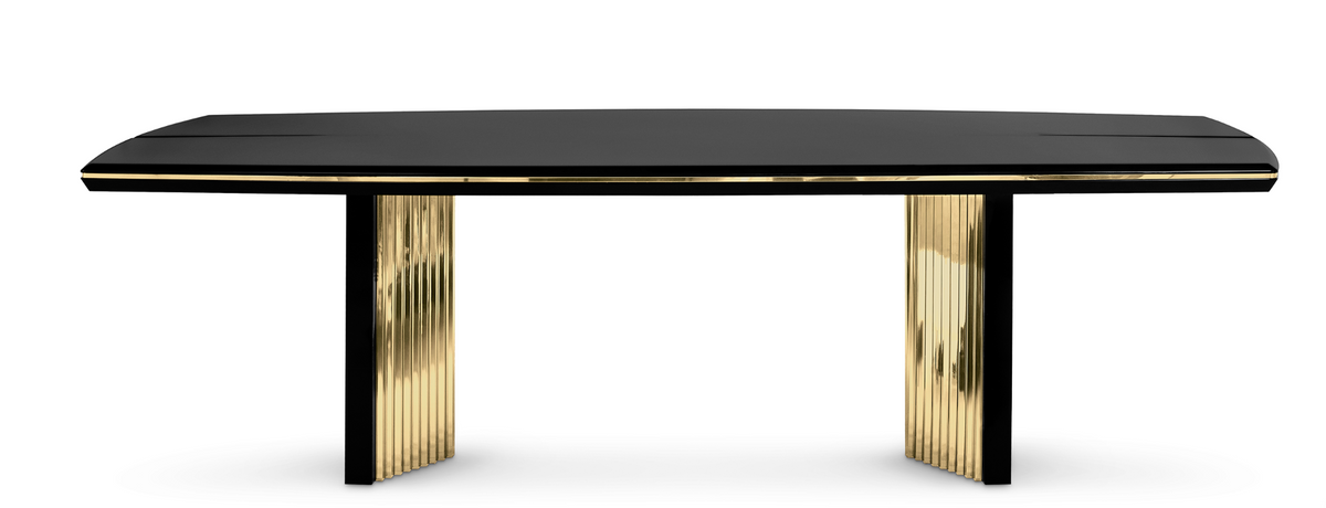 • Stół jadalny Beyond marki Luxxu łączy ręcznie obrabiane drewno z akcentami polerowanego mosiądzu, tworząc ciepły i złoty odcień na polerowanej powierzchni.
