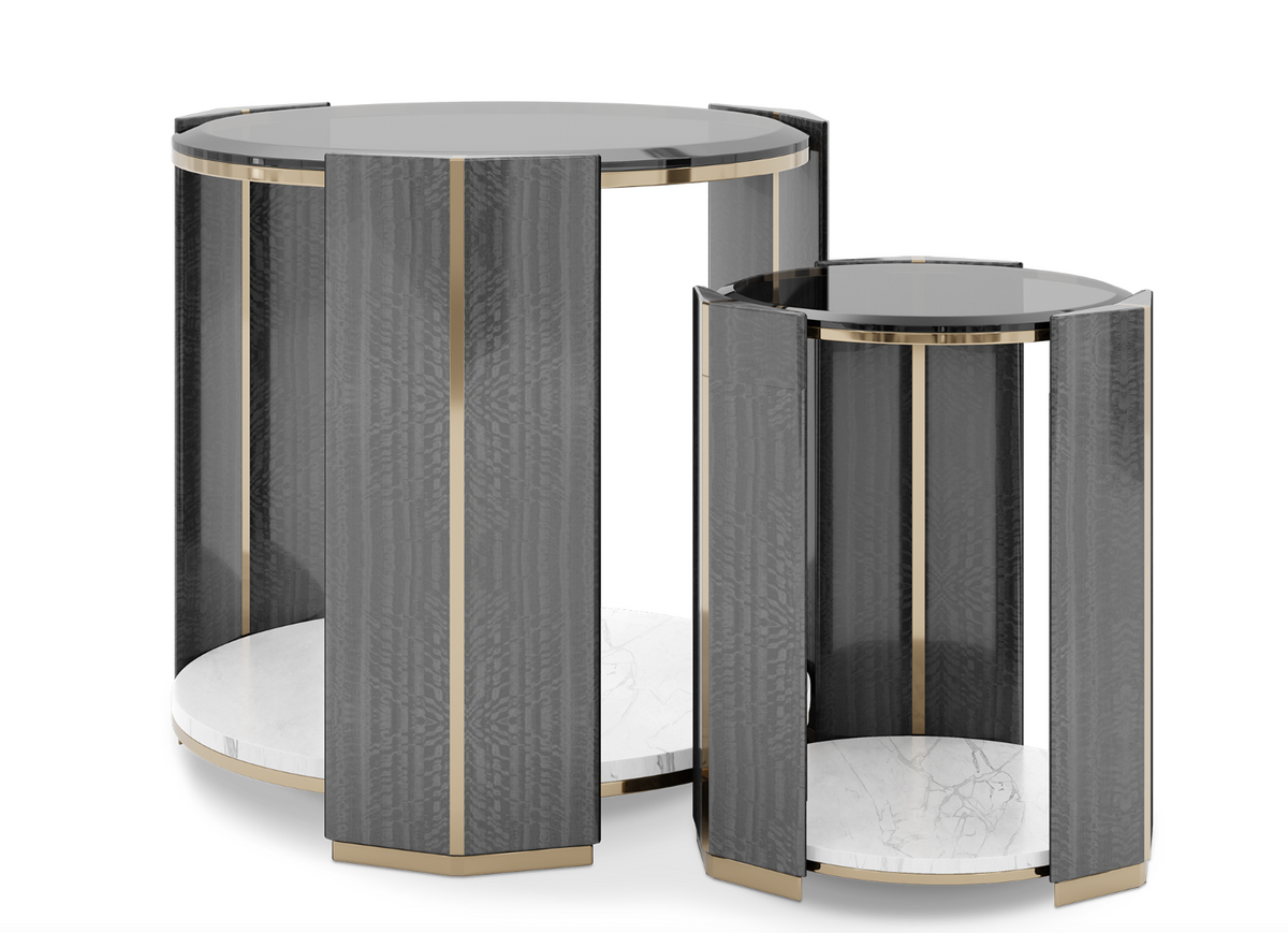 - Stolik boczny Algerone Small marki Luxxu wykonany z eukaliptusowego forniru Frisé, posiada blat z przydymionego szkła, marmurową podstawę i mosiężne detale.