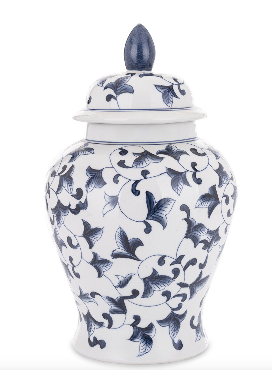 Waza XL została wykonana z porcelany w białym kolorze oraz wykończona granatowym motywem w kształcie liści.