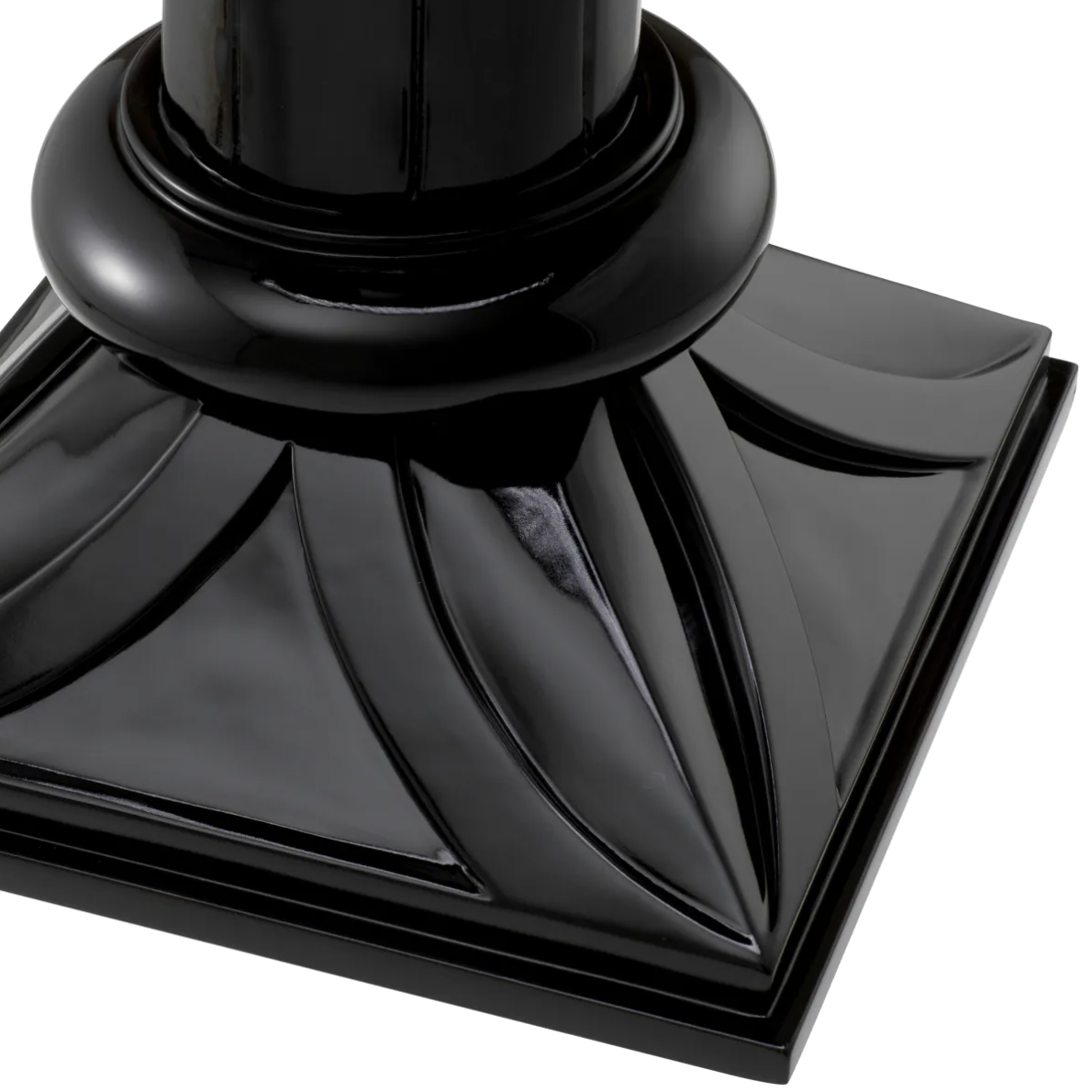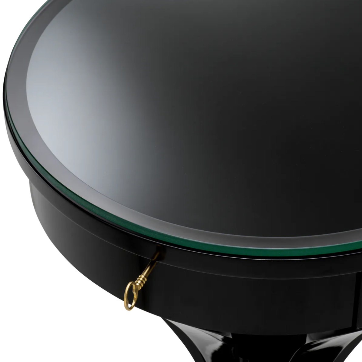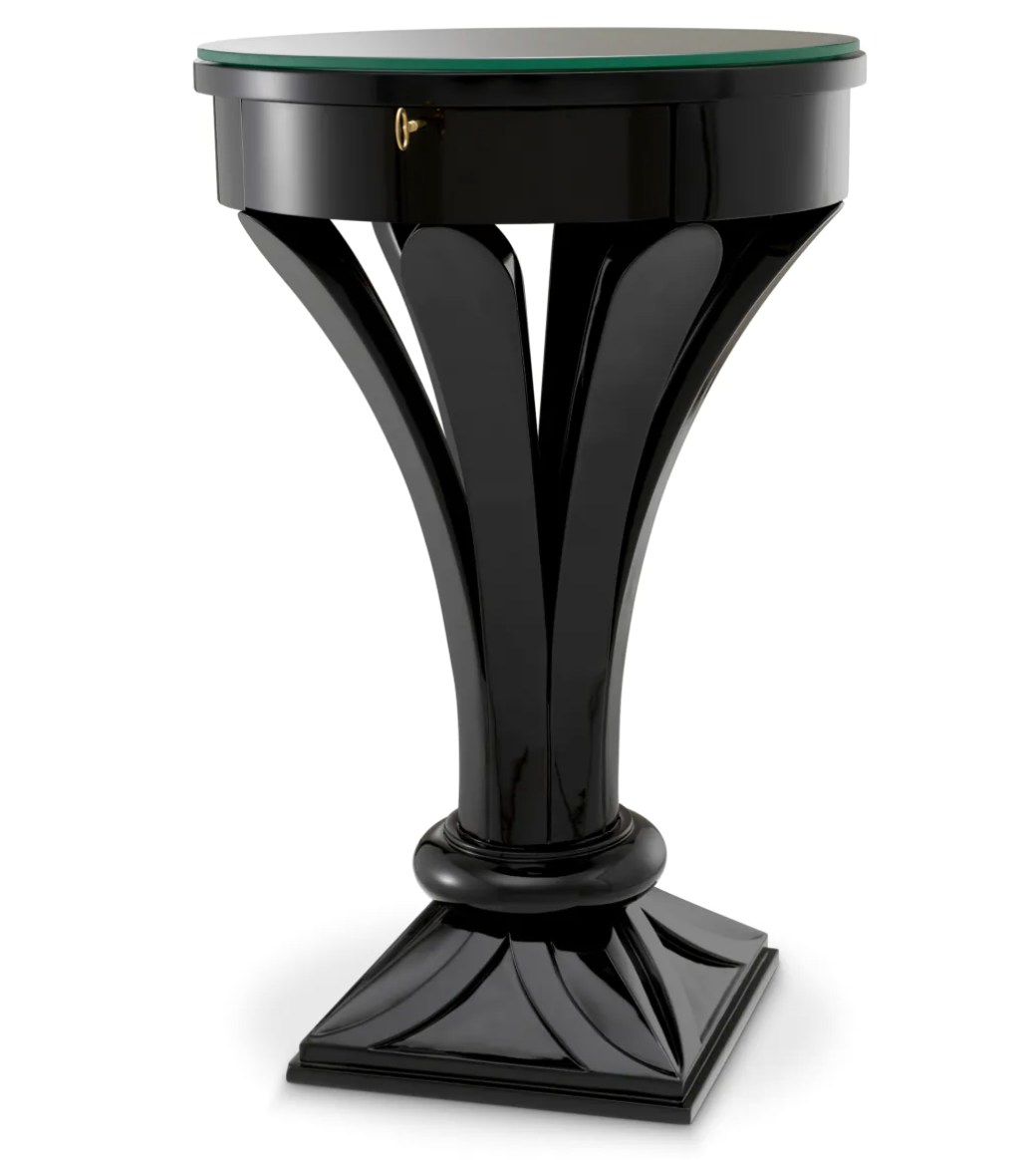 Stolik boczny Aswan marki Eichholtz, nawiązuje do elegancji form starożytnego Egiptu, charakteryzuje się wykończeniem w kolorze fortepianowej czerni, posiada szufladkę i blat z przezroczystego szkła.
