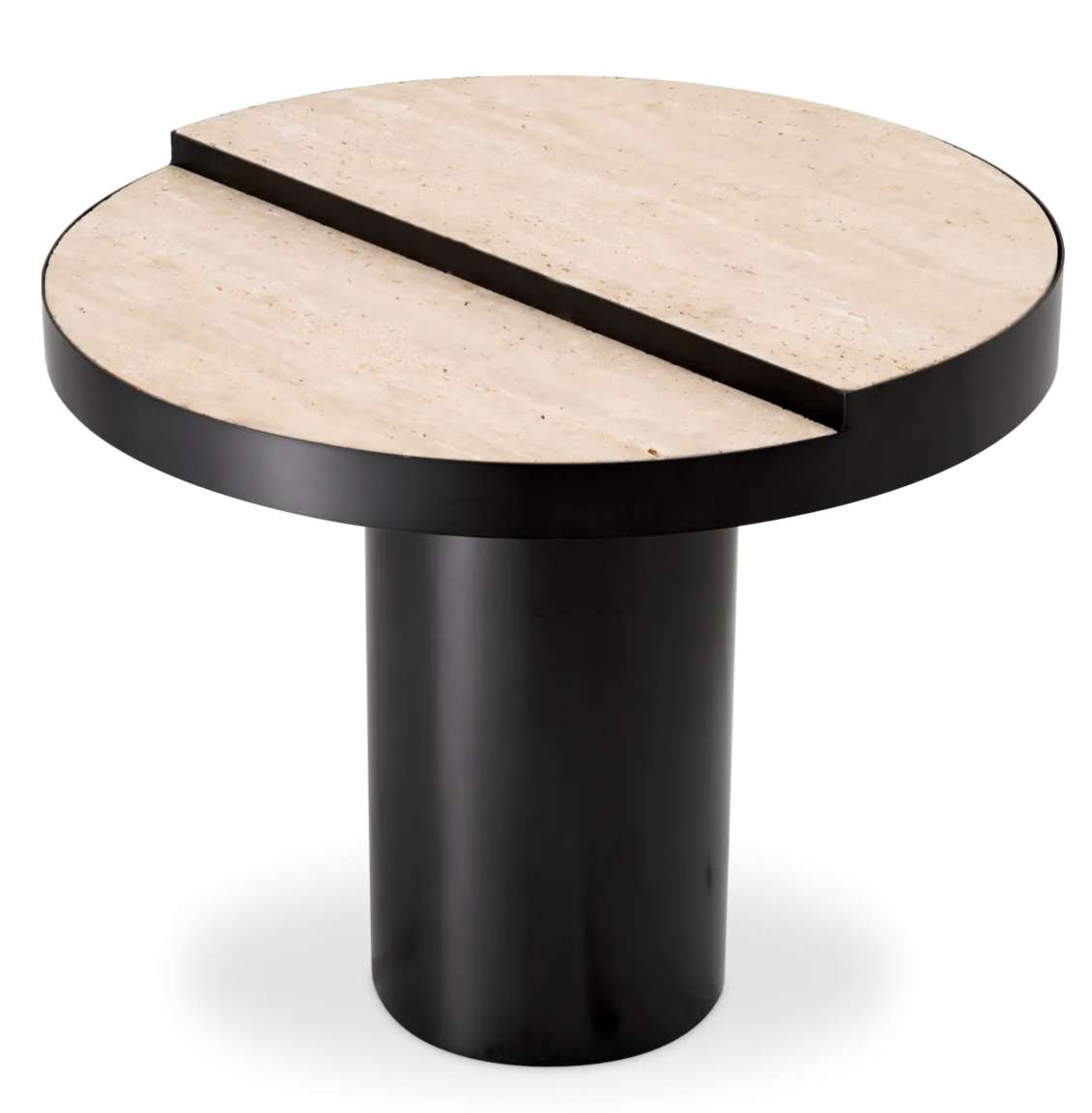 - Stolik kawowy Excelsior firmy Eichholtz, blat wykonany z dwóch półokrągłych płyt z trawertynu, na różnych poziomach. Podstawa i obręcz wykonana z brązu.
