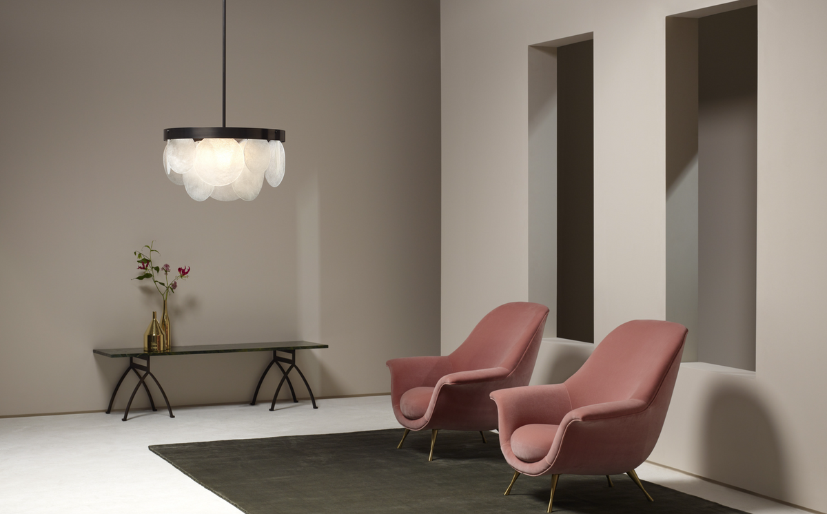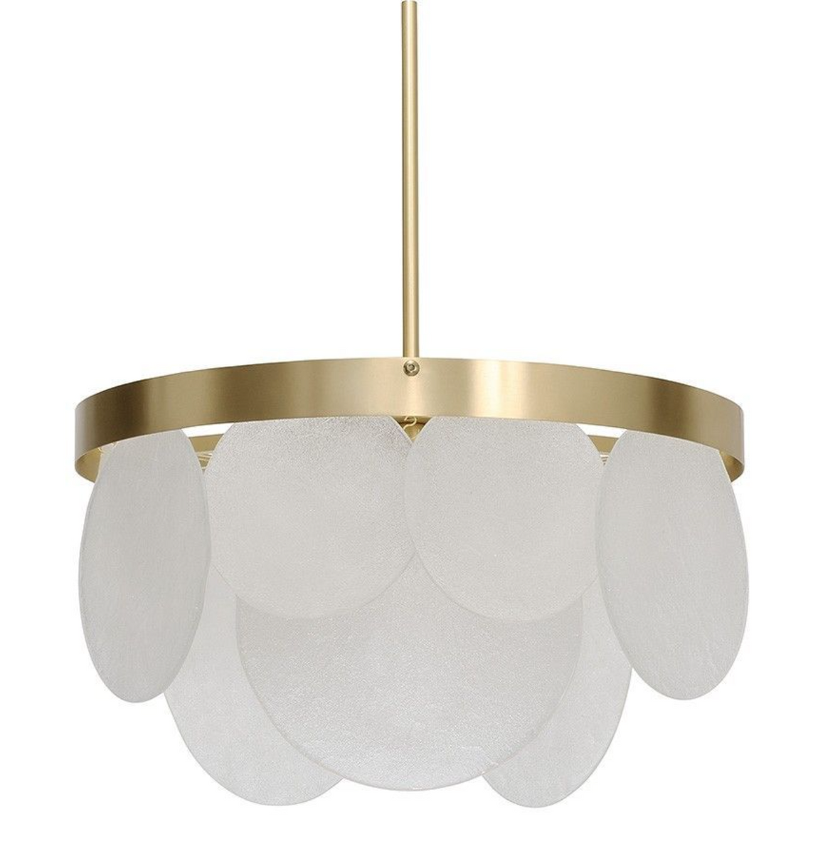- Żyrandol Sasha marki CTO Lighting, kropelki są ręcznie formowane na szkle w procesie, który tworzy faliste i krystaliczne tekstury. Półprzezroczyste szkło jest oprawione w metalowej konstrukcji.