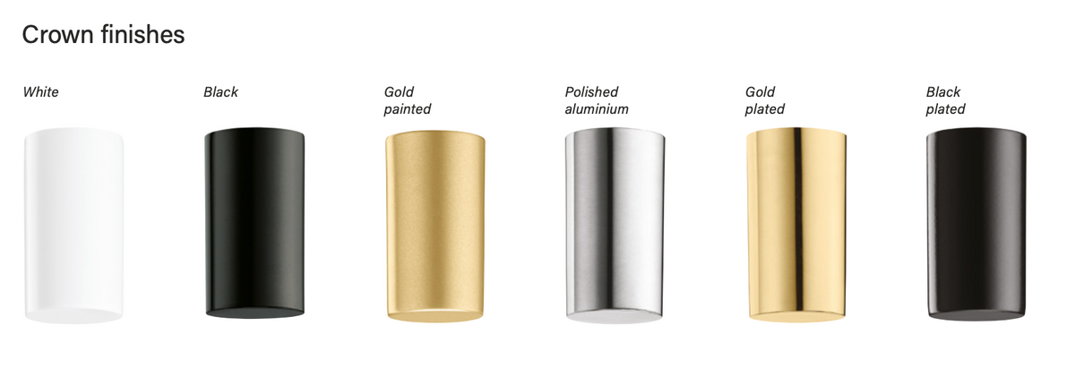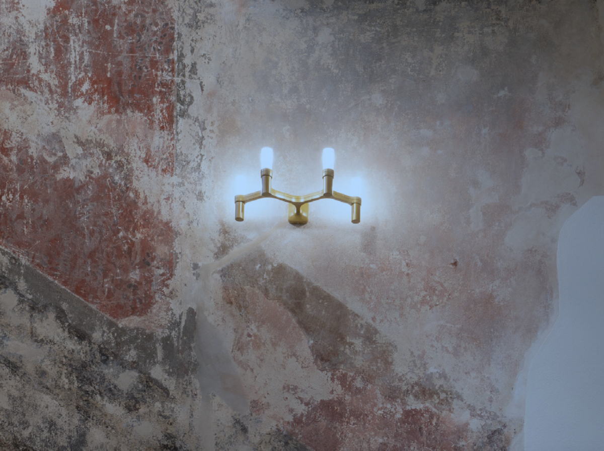 - Kinkiet Crown 4 marki Nemo Lighting, w kolorze złotym, zainspirowany kształtem płatków śniegu. występuje w dwóch rozmiarach i kolorach szkła oraz wielu wykończeniach.