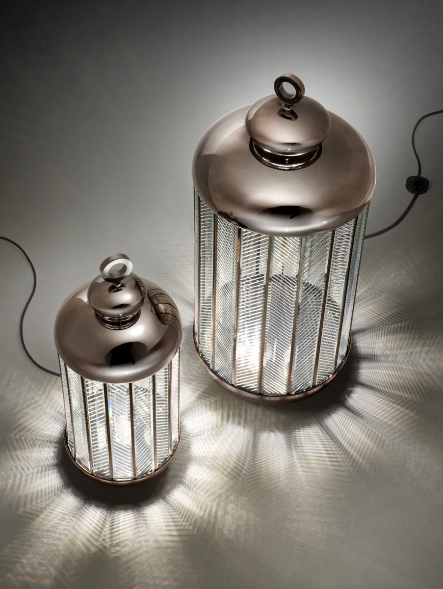 • Lampa podłogowa Fata Morgana marki Italamp, wykonana z metalu z wykończeniem w kolorze żelaznej szarości, antycznego oksydowanego lub antycznego złota i rzeźbionym szklanym kloszem.