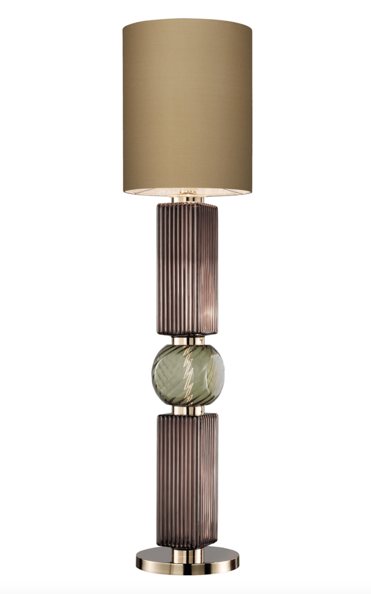 Lampa podłogowa Matilda marki Italamp z metalową konstrukcją w jasnym złotym wykończeniu, z korpusem z dmuchanego szkła i kloszem z tkaniny. Dostępne w różnych kolorach.