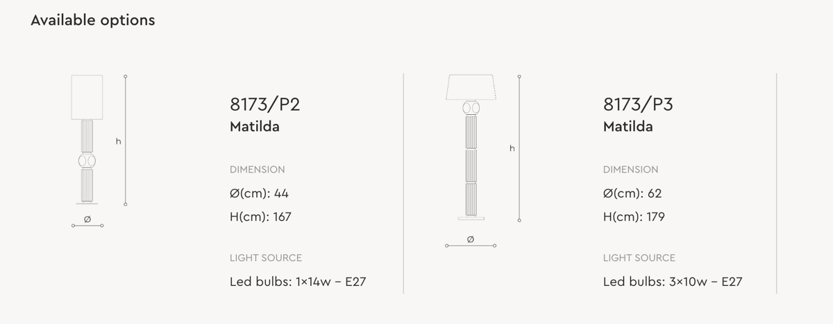 - Lampa podłogowa Matilda marki Italamp z metalową konstrukcją w jasnym złotym wykończeniu, z korpusem z dmuchanego szkła i kloszem z tkaniny. Dostępne w różnych kolorach.