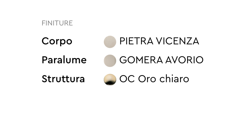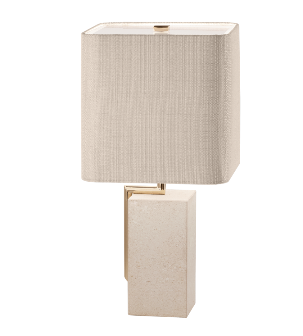 • Lampa stołowa Tinta marki Italamp z kloszem z tkaniny w kolorze kości słoniowej. Metalowa rama z jasnozłotym wykończeniem i kamieniem Vicenza.