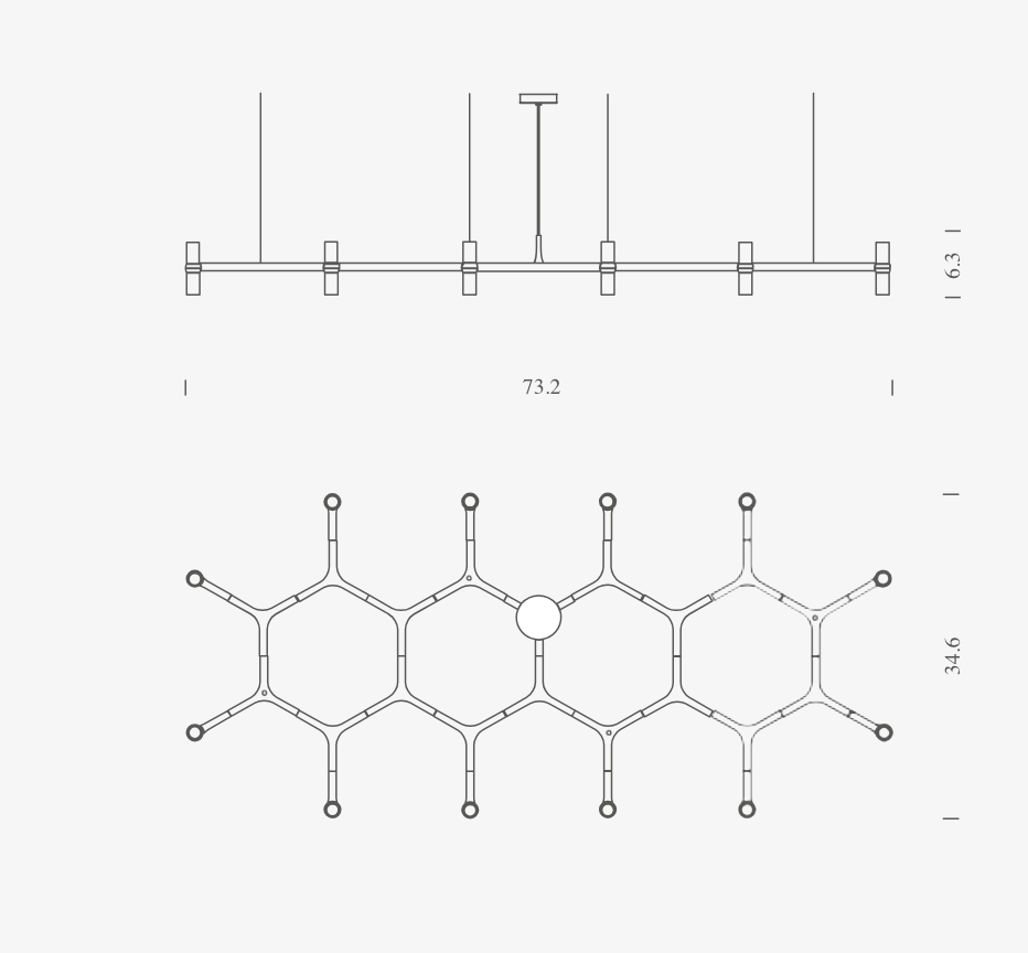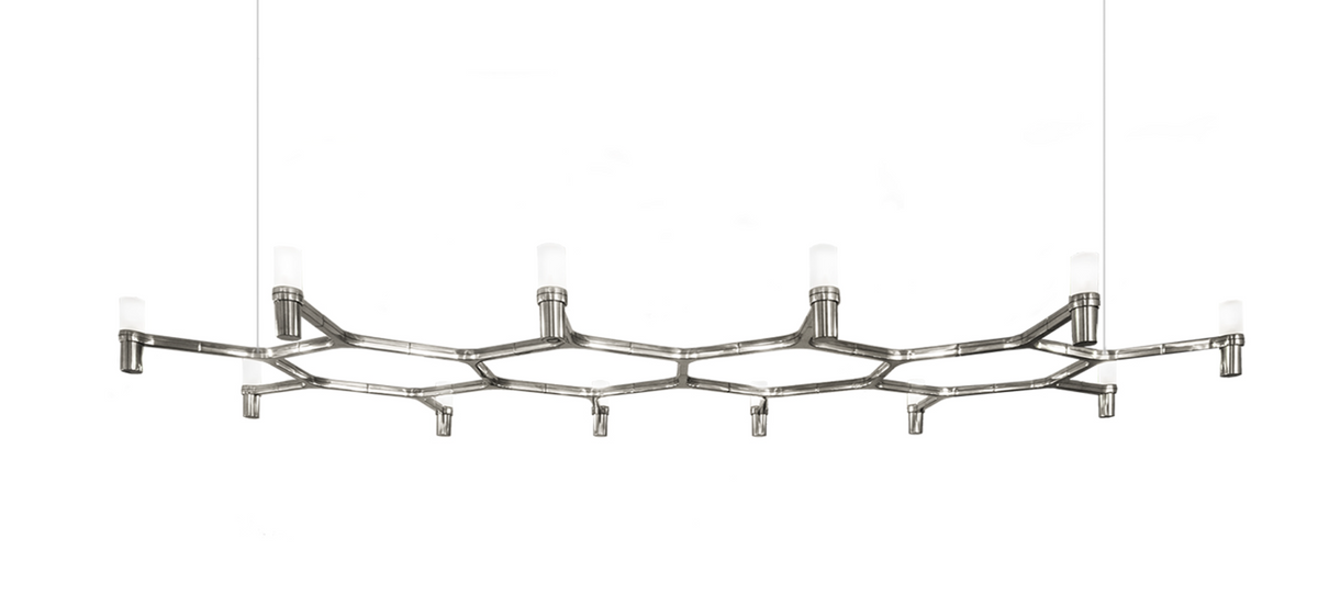 Żyrandol Crown Plana Major marki Nemo Lighting, w kolorze polerowanego aluminium, zainspirowany kształtem płatków śniegu, posiada modułową strukturę. Wymiary: dł. 186 x szer. 88 cm