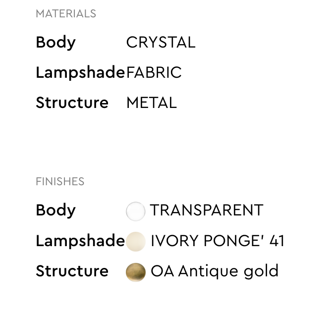 - Lampa stołowa Tavolo marki Italamp, z przezroczystym rzeźbionym kryształem, metalową podstawą z antycznym złotym wykończeniem i plisowanym kloszem z tkaniny w kolorze kości słoniowej. Dostępna w dwóch rozmiarach.