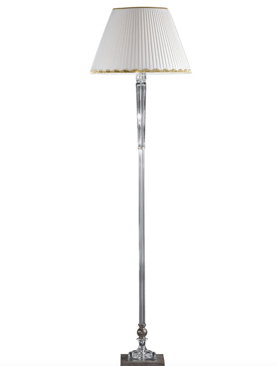 - Lampa podłogowa Tavolo marki Italamp, z przezroczystym rzeźbionym kryształem, metalową podstawą z antycznym złotym wykończeniem i plisowanym kloszem z tkaniny w kolorze kości słoniowej. Dostępna w dwóch rozmiarach.
