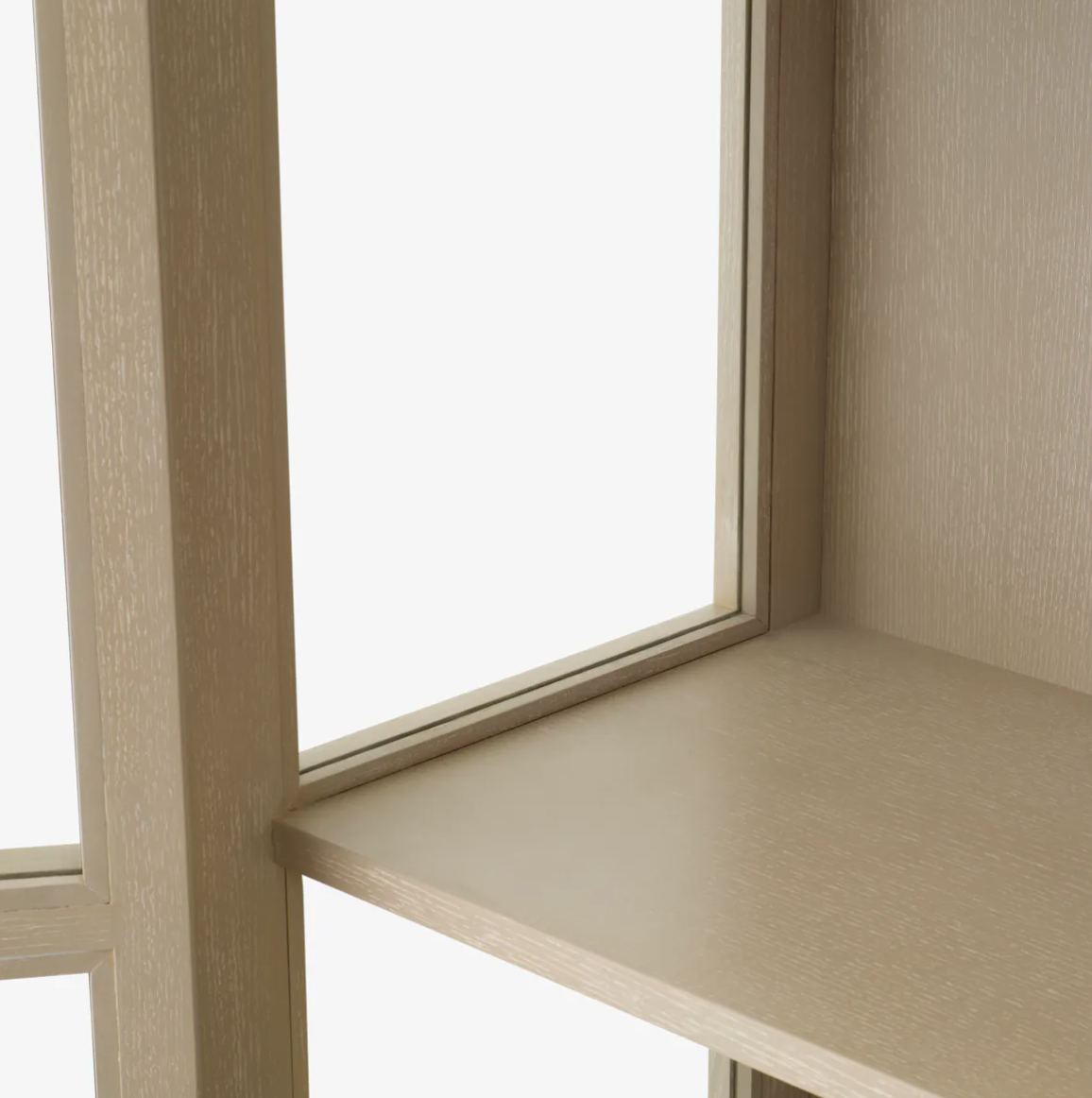 - Regał San Bernardino marki Eichholtz, wykończony w fornirze z dębu płukanego, ma łukowatą sylwetkę i przezroczyste szklane panele oraz brązowe uchwyty.