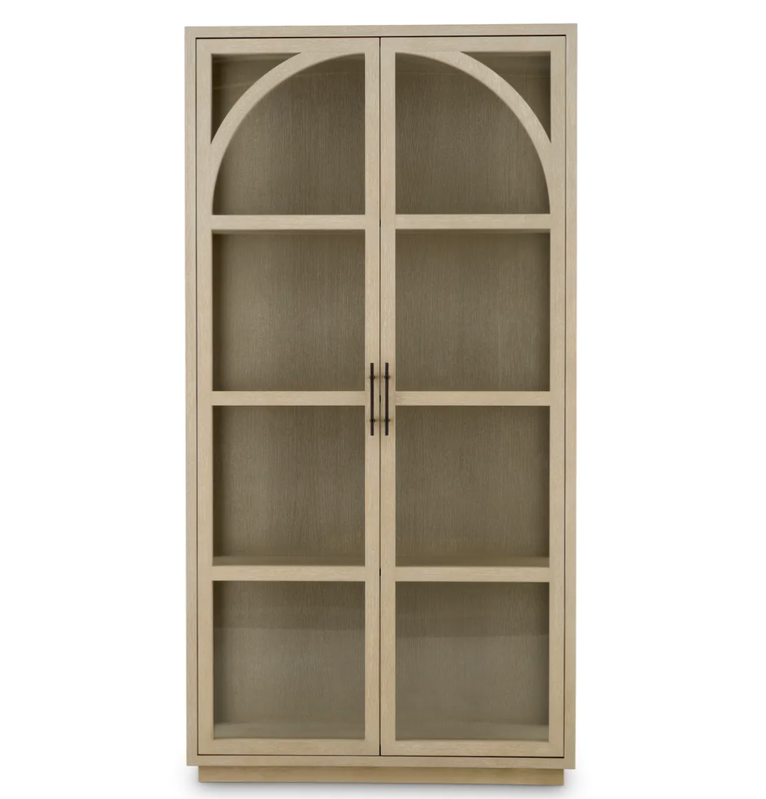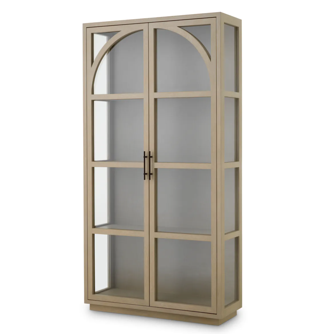 Regał San Bernardino marki Eichholtz, wykończony w fornirze z dębu płukanego, ma łukowatą sylwetkę i przezroczyste szklane panele oraz brązowe uchwyty.