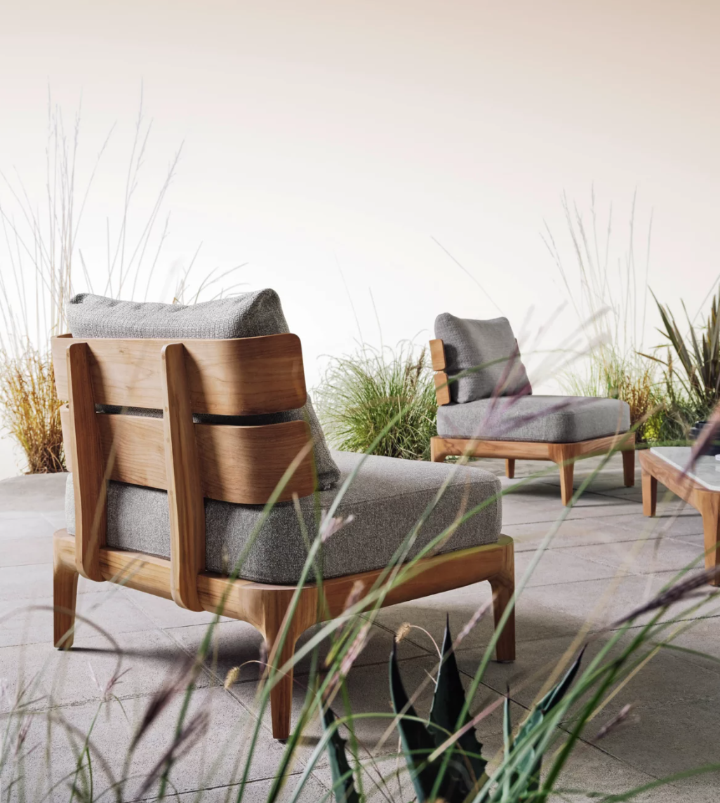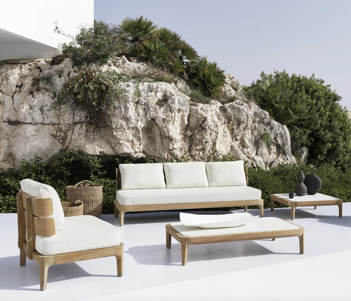 - Fotel Mediterraneo 01 marki Gervasoni 1882, posiada ramę z drewna tekowego i miękkie poduszki ze zdejmowanym pokrowcem.