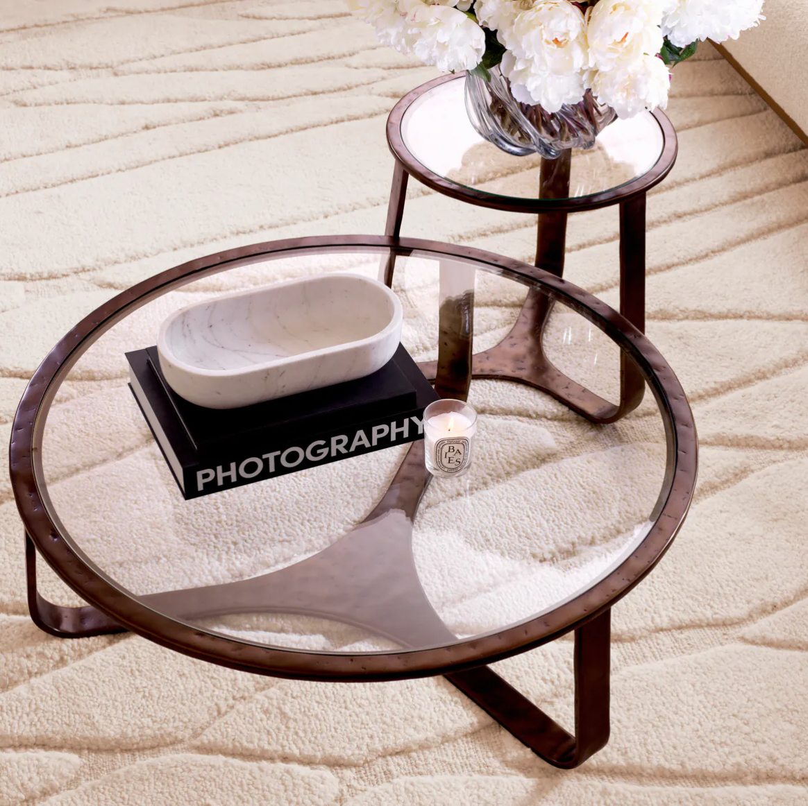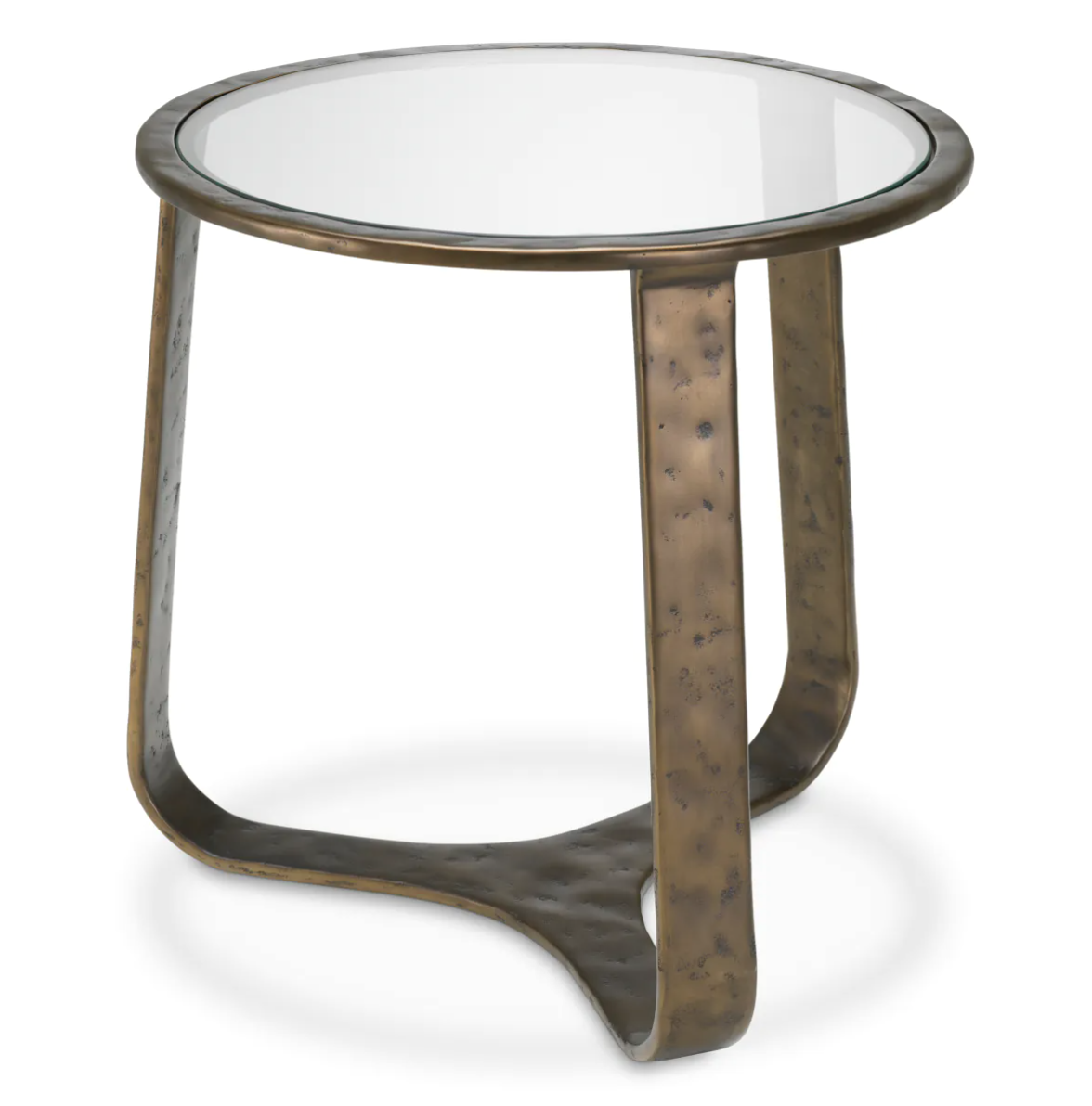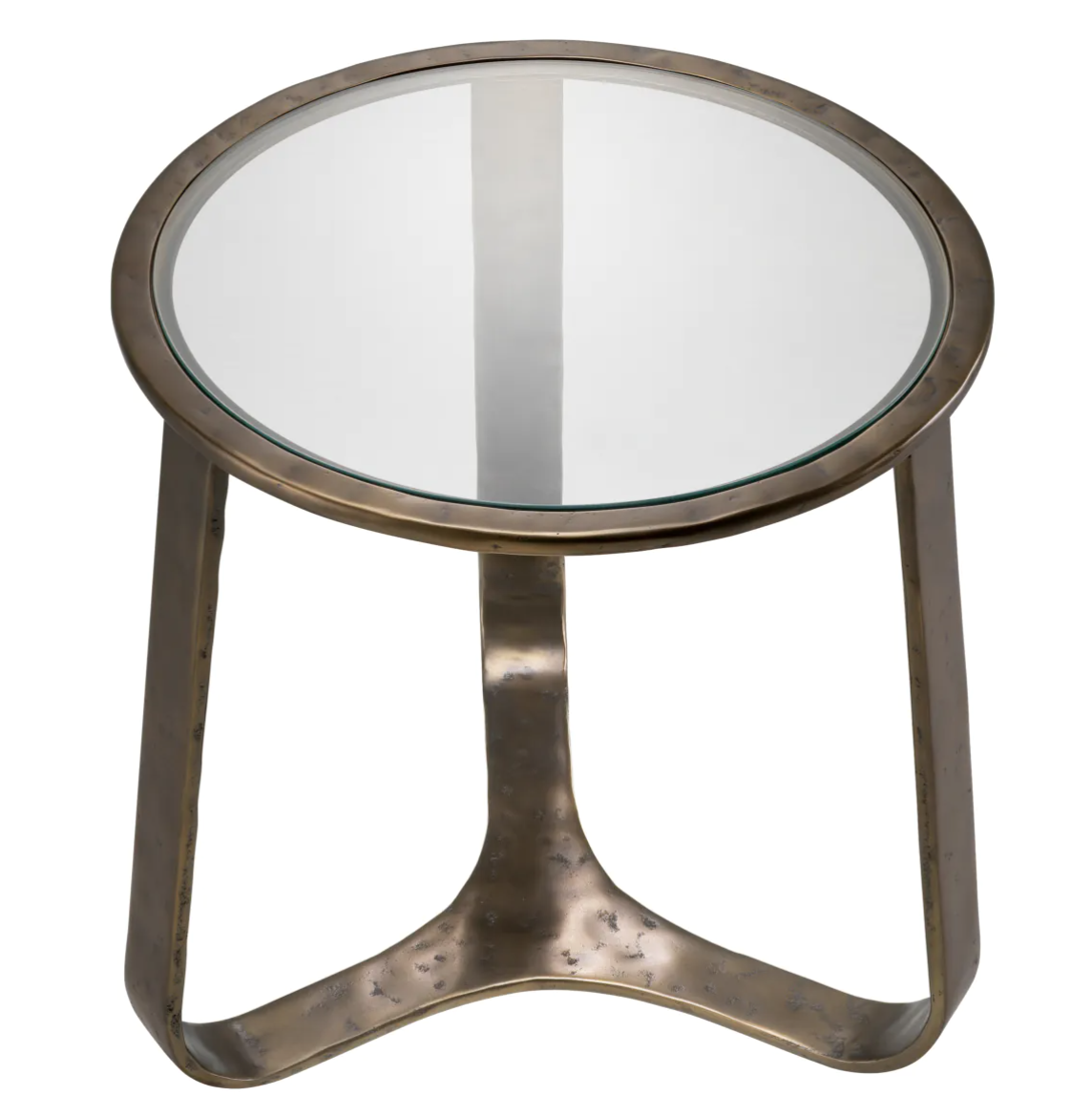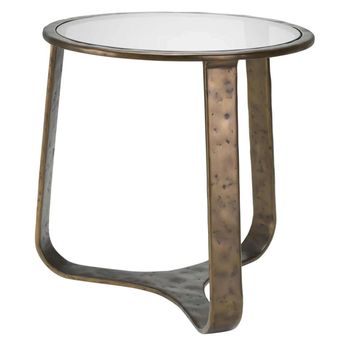 Stolik boczny Cambronne marki Eichholtz, posiada drobno młotkowaną podstawę z odlewanego aluminium w brązowym wykończeniu, z eleganckim blatem z przezroczystego szkła. Wymiary: Ø 50 | H. 50.5 cm