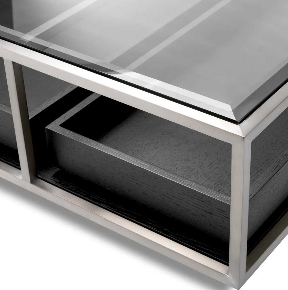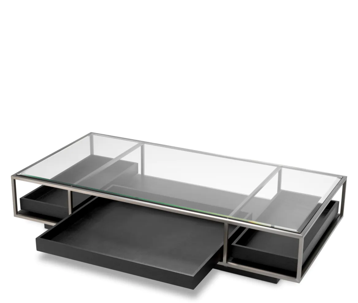 Stolik Roxton firmy Eichholtz, wykończenie ze szczotkowanej stali, przezroczystego szkła i czarnego lub szarego forniru. Posiada szuflady na kółkach. Wymiary: dł. 180 | szer. 90 | wys. 37 cm