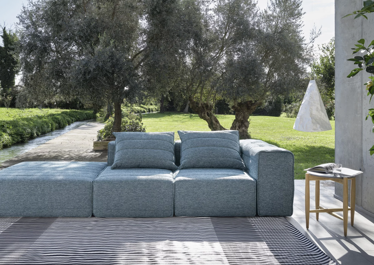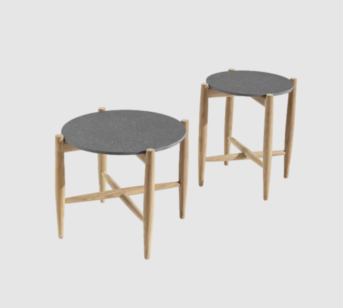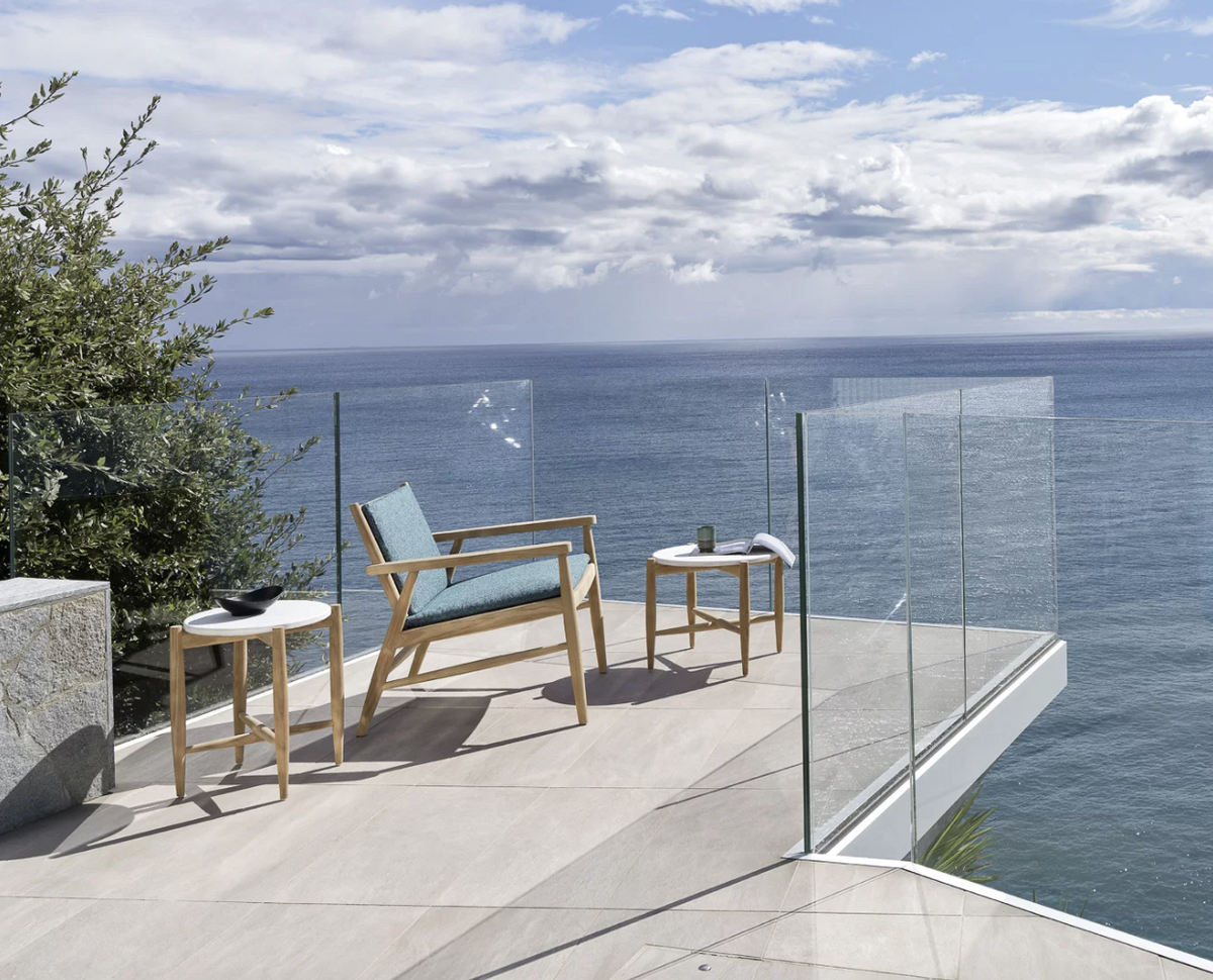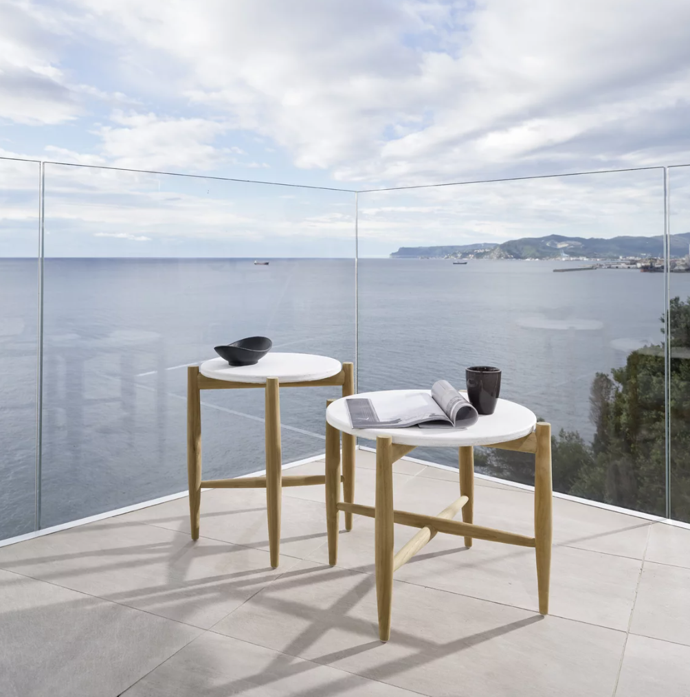 - Stolik Eidos marki Gervasoni 1882, posiada konstrukcję z drewna tekowego oferuje blaty z betonu Pearl, gresu Lava Stone lub teksturowanego szarego szkła Slate, znakomity do przestrzeni zewnętrznych.
