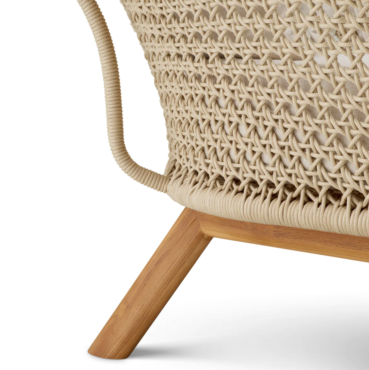 Sofa ogrodowa Trinity marki Eichholtz posiada białą tapicerkę Flores, splecioną z kremową liną i zakotwiczoną w eleganckim naturalnym drewnie tekowym. W komplecie pluszowe poduszki. Wymiary: W. 180 | D. 92 | H. 74 | SD. 60 | SW. 163 | SH. 46 | AH. 64 cm