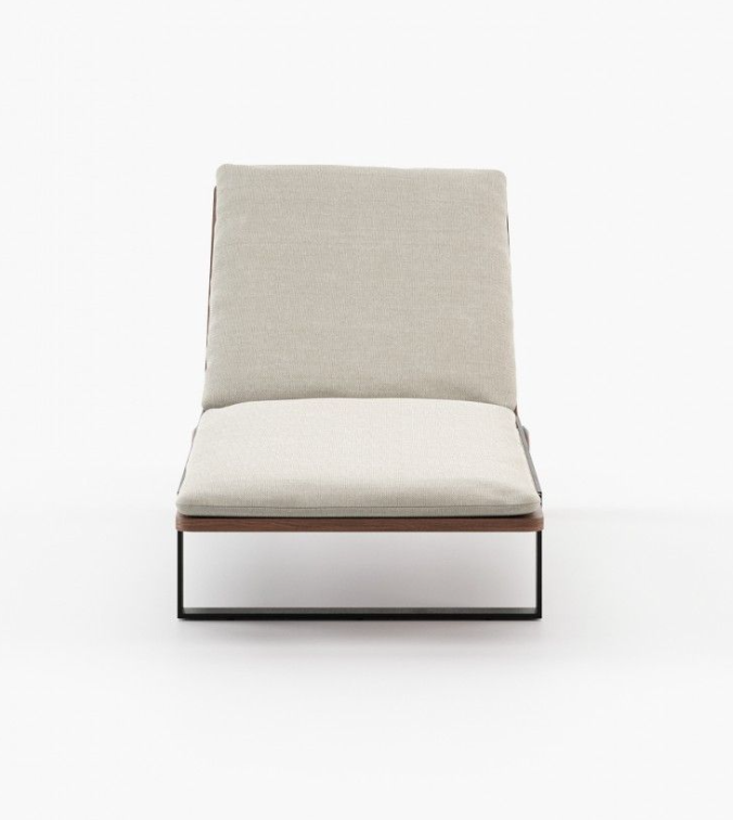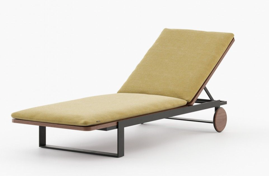 Leżak ogrodowy Salim marki Laskasas posiada teksturowaną czarną żelazną ramę z ciemnymi akcentami z drewna Kambala oraz kółka zaprojektowane z myślą o łatwym transporcie. Występuje w różnych rodzajach wykończeń.