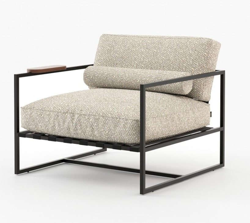 Fotel ogrodowy Badi marki Laskasas, posiada teksturowaną czarną żelazną ramę i tapicerkę z tkaniny Talin Sand, zapewni długotrwały komfort i styl. Można wybrać rozmiar, tapicerkę (tkaniny i skóry), materiały (drewno, marmury i metale). Wymiary: 88 x 84 x 76.2 cm