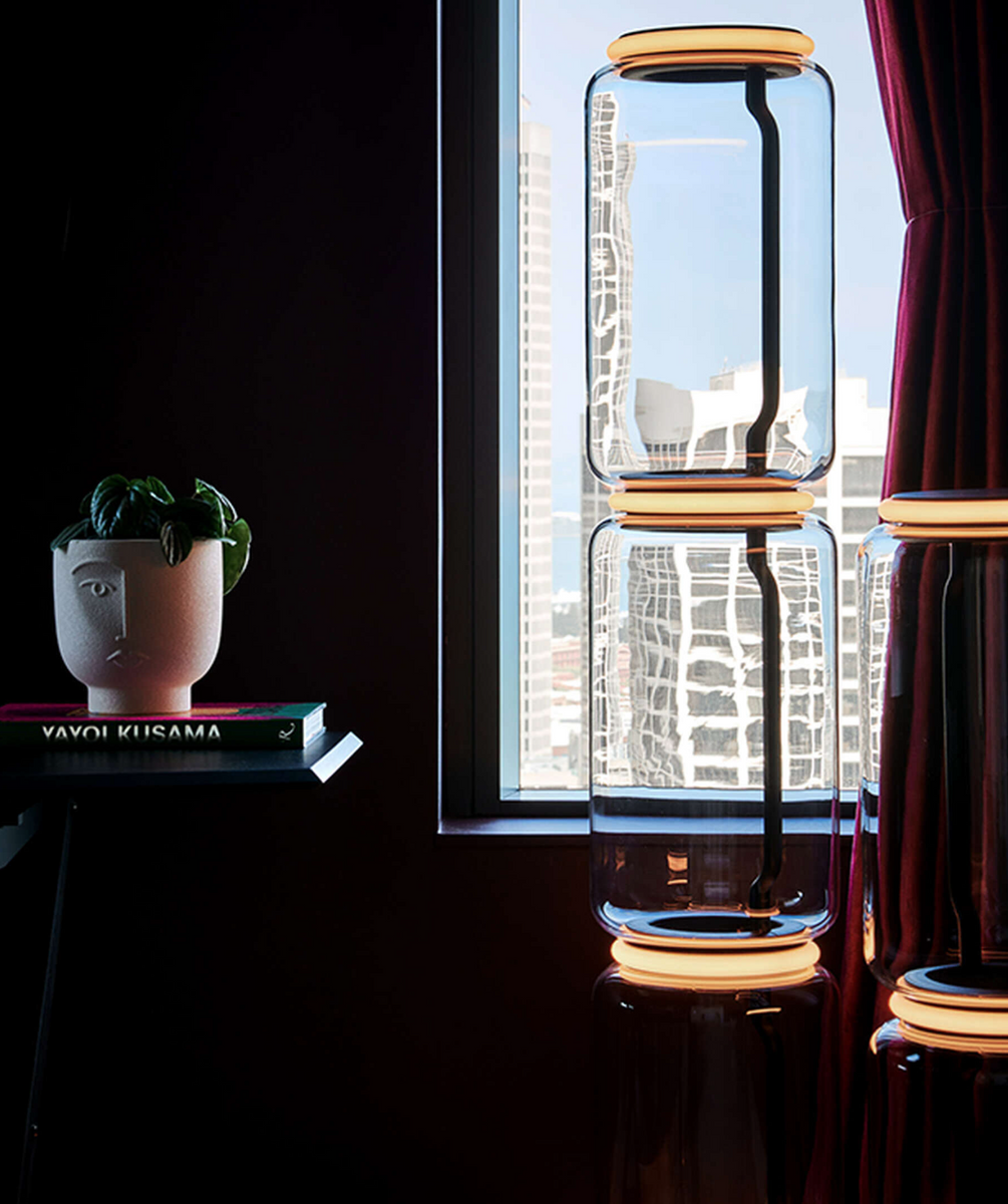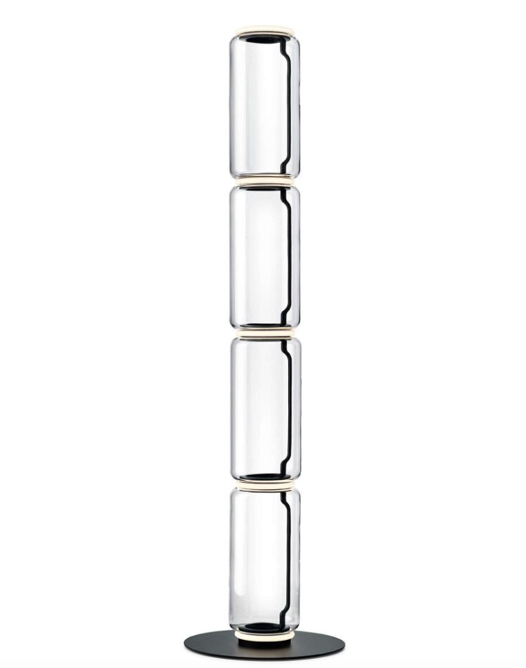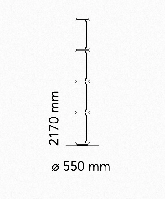 Lampa podłogowa Cylinder Big Base marki Flos, zaprojektowana przez Konstantina Grcica, 2019 r. składa się z połączonych ze sobą szklanych modułów osiągających wysokość 2,17 metra (85,43"). Cylindryczna i półsferyczna struktura z przezroczystego dmuchanego szkła, podstawa i pierścienie z odlewanego ciśnieniowo aluminium, wewnętrzne boczne ramiona z hydroformowanej stali i formowane wtryskowo opalowe dyfuzory z silikonowym pierścieniem zewnętrznym. Kabel zasilający ma długość 2 metrów (78,74"), a panel sterowany pedałem służy jako ściemniacz do regulacji natężenia światła w zakresie od 10% do 100% w dowolnym kierunku. Zasilacz naścienny z wymiennymi wtyczkami.Wymiary: wys. 117 x Ø podstawy 55 cm