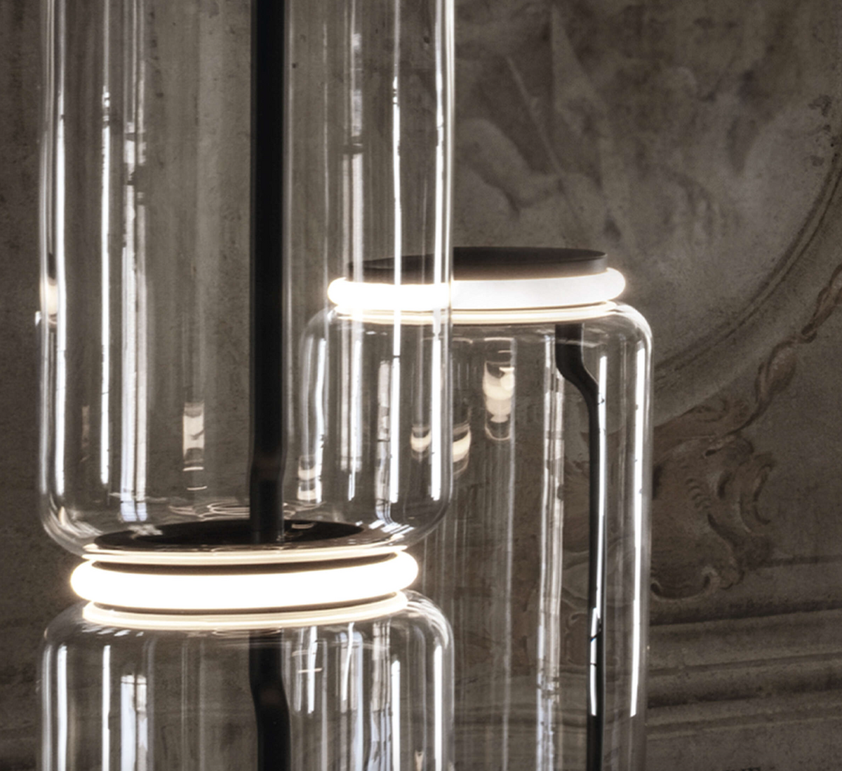 • Lampa podłogowa Cylinder Big Base marki Flos, posiada cylindryczną strukturę z przezroczystego dmuchanego szkła, podstawa i pierścienie z aluminium, wewnętrzne boczne ramiona ze stali.