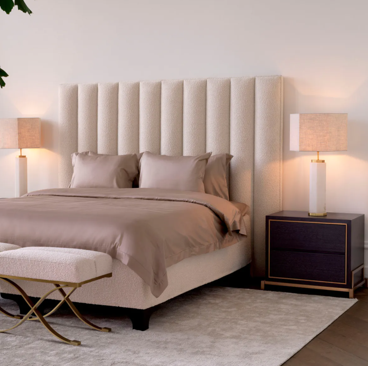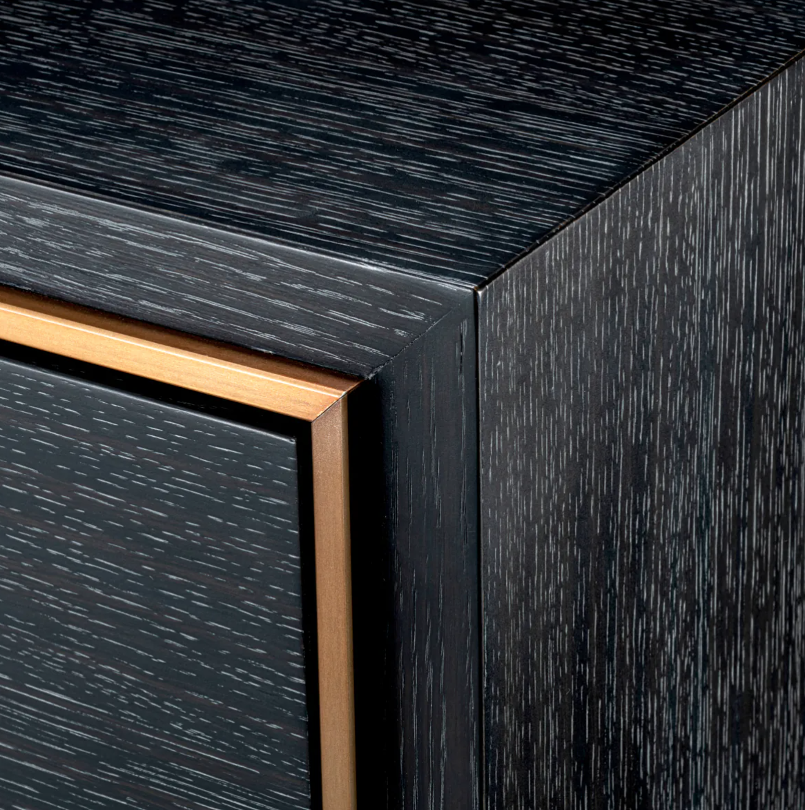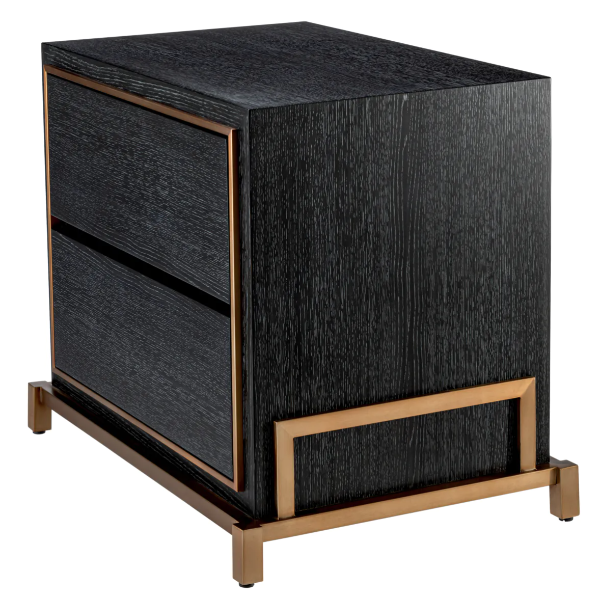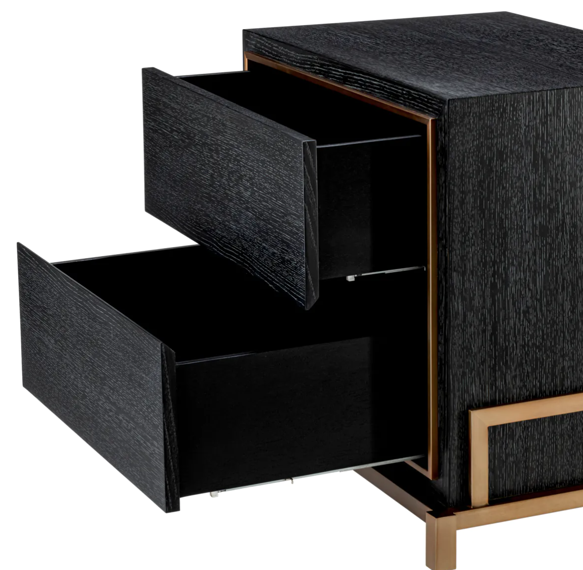 - Szafka nocna Hazel marki Eichholtz, obudowana fornirem z szarego dębu, ozdobiona ramą ze szczotkowanego mosiądzu, posiada dwie szuflady, podkreśli styl Twojej sypialni.