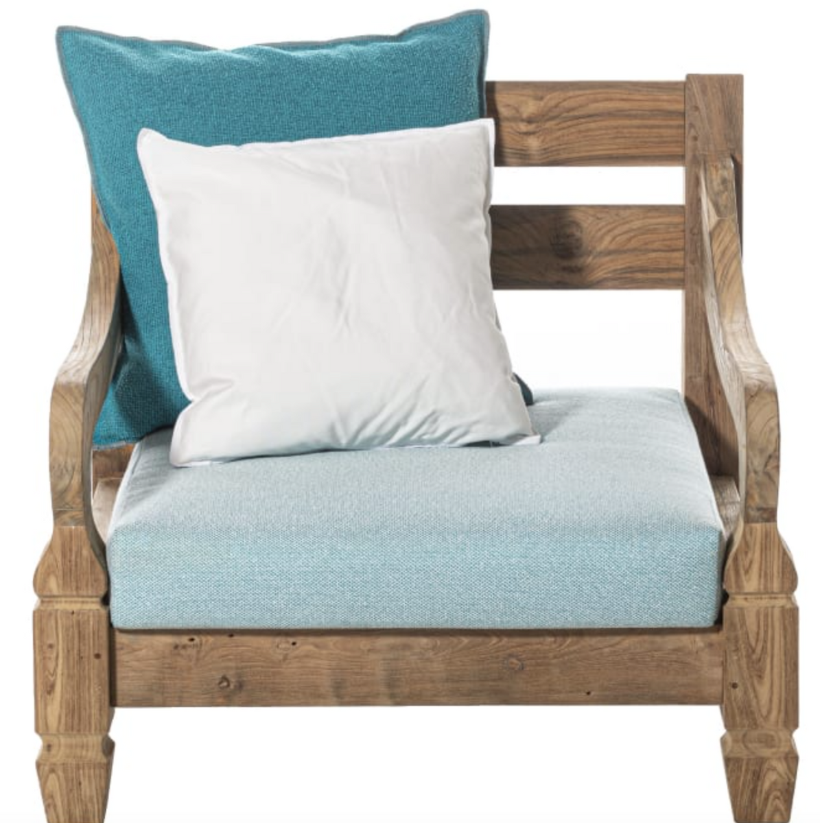 Fotel Jeko 05 marki Gervasoni 1882, posiada ramę z ECOTeak, charakteryzuje się niskim siedziskiem ze zdejmowaną poszewką, do której można dodać luźne poduszki w celu zwiększenia komfortu. ECOTeak, materiał pochodzący z ponownego wykorzystania odzyskanych belek i elementów z drewna tekowego, naprawionych drewnem z recyklingu, zmontowanych i oszlifowanych w celu podkreślenia oryginalnego usłojenia. Wymiary: szer. 92 x wys. 80 cm