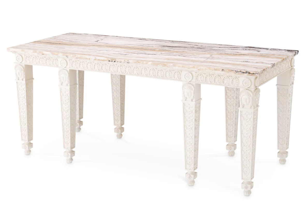- Stół konsolowy Croome Court marki Eichholtz ma postarzane białe wykończenie i marmurowy blat. Jego konstrukcja przywołuje kinetyczną energię tynków Alkena, płynnie łącząc historyczny urok ze współczesną elegancją.
