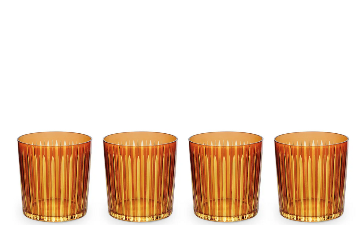Zestaw czterech szklanek L'Objet z kolekcji Prism ręcznie ciętych i dekorowanych w kolorze bursztynowym. Dostępne również w kolorze zielonym, fioletowym i bordowym. Wymiary: 9 cm x 9,25 cm. Pojemność 38 cl
