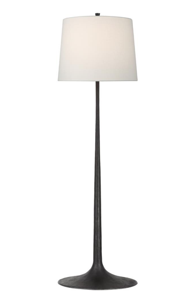 Lampa podłogowa Oscar projektu Barbara Barry marki Visual Comfort z metalową podstawą, która zwęża się ku górze, dostępna w kilku opcjach wykończenia. Lniany abażur rzuca miękkie, ciepłe światło. Wymiary: 158.1 x  47 x podstawa 35 cm x 47 cm owalna