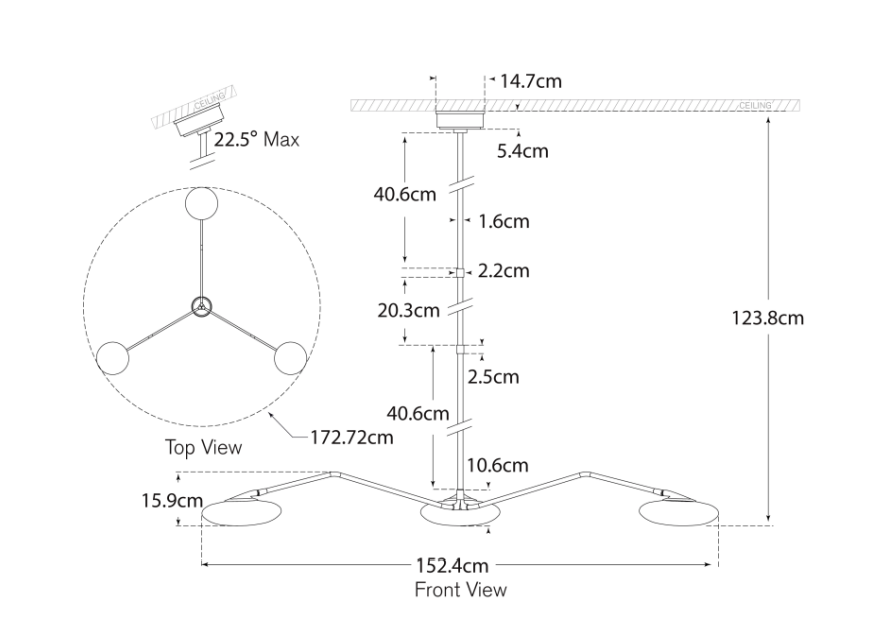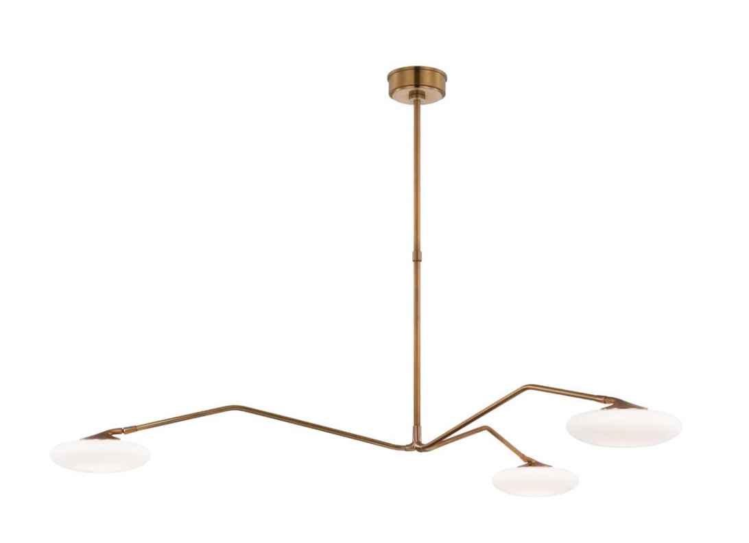 Żyrandol Brindille Extra Large projektu Champalimaud marki Visual Comfort posiada smukłe ramiona z brązu, polerowanego niklu lub miękkiego mosiądzu, które podtrzymują białe szklane klosze przypominające płatki. Dzięki mosiężnej technice montażu w kształcie łyżki, mogą one obracać się o 360 stopni, oferując zróżnicowane i regulowane oświetlenie. Wymiary: wys. 123.8 x szer. 152.4 x baldachim 14,6 cm