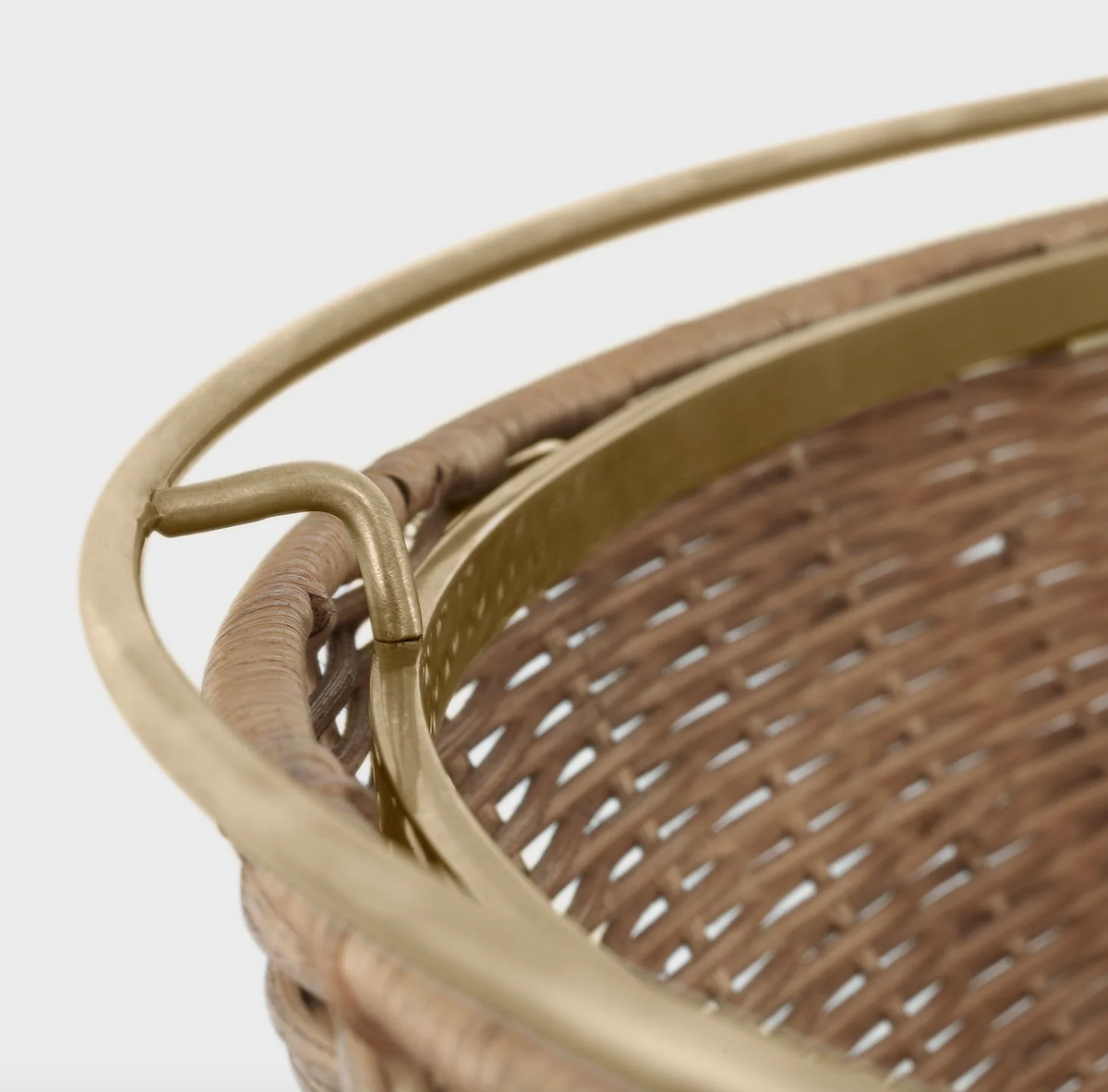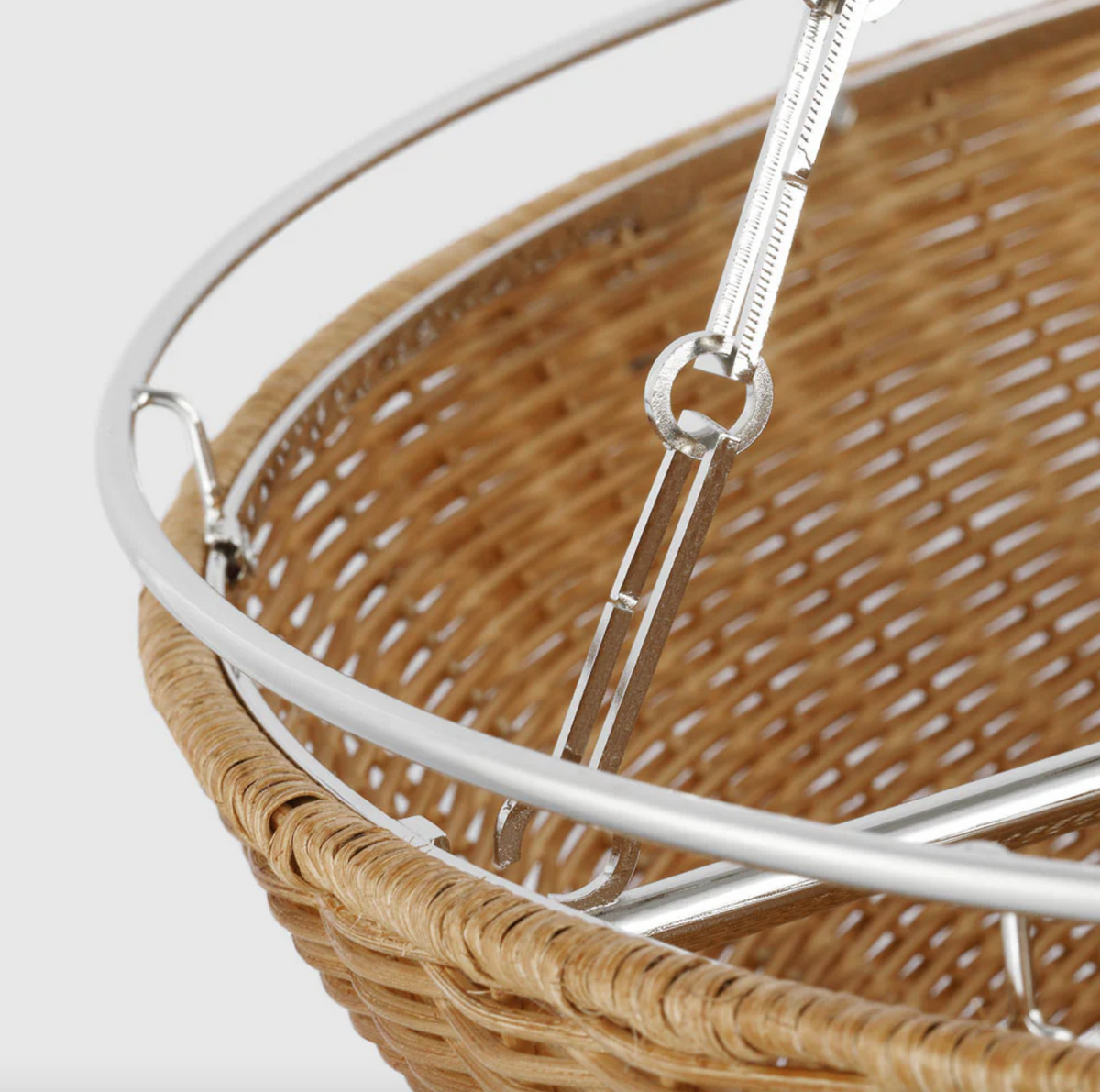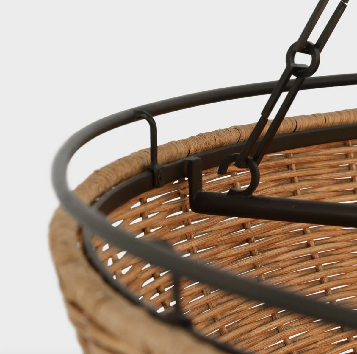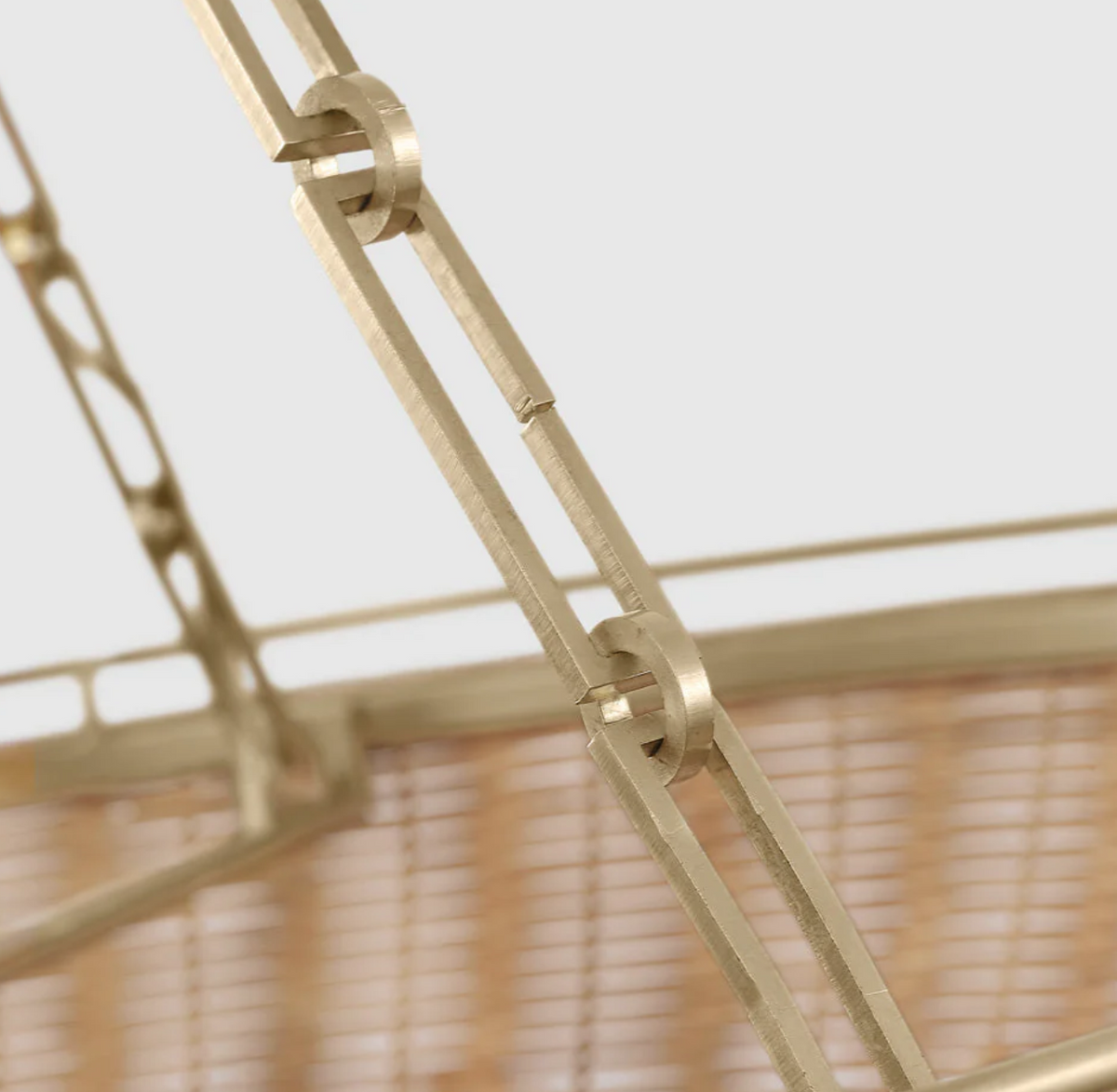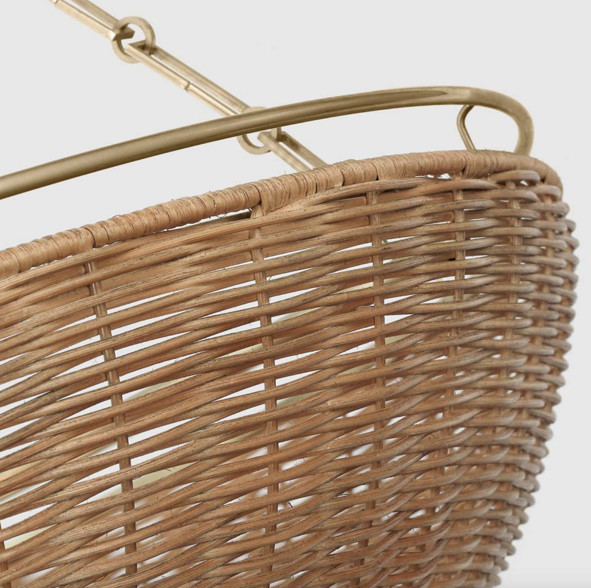 - Żyrandol Clovis Medium projektu Chapman & Myers marki Visual Comfort posiada klosz z plecionej naturalnej wikliny oraz ramą ze szczotkowanego mosiądzu.