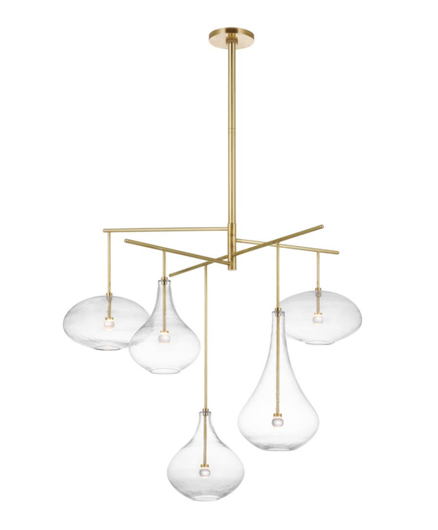 - Żyrandol Lomme XL projektu Champalimaud marki Visual Comfort z ręcznie dmuchanymi kloszami z przezroczystego szkła w formie kropel wody z wdziękiem zawieszonych na armaturach z brązu, niklu lub mosiądzu.